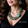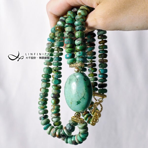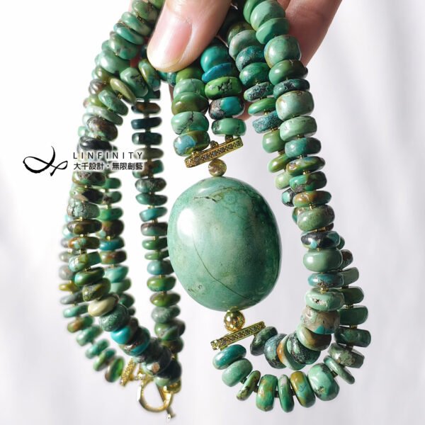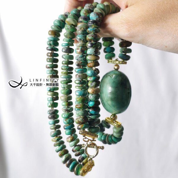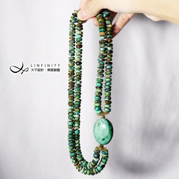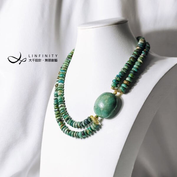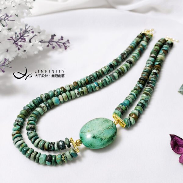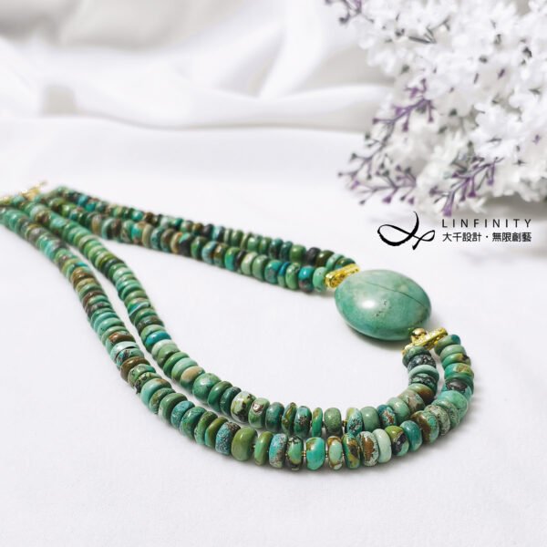 設計師以綠松石手工磨製隨形扁片、大滾石,設計二層短項鍊。