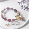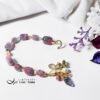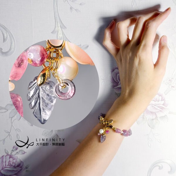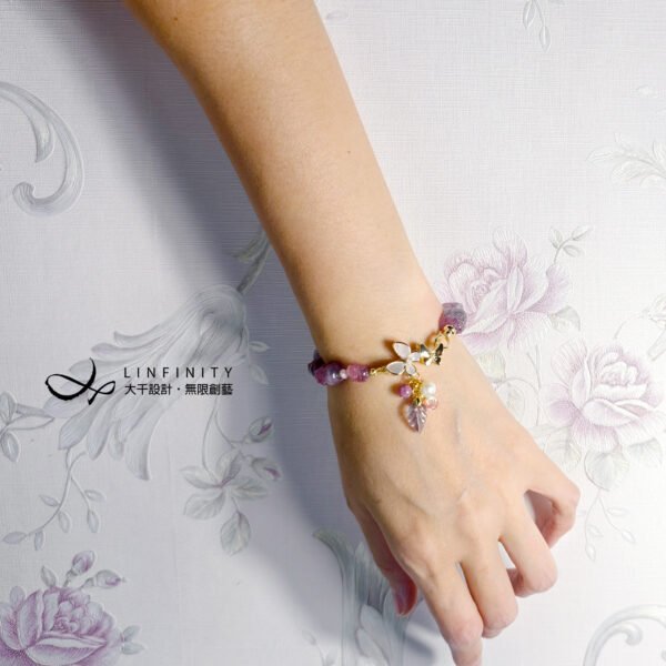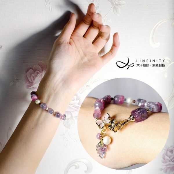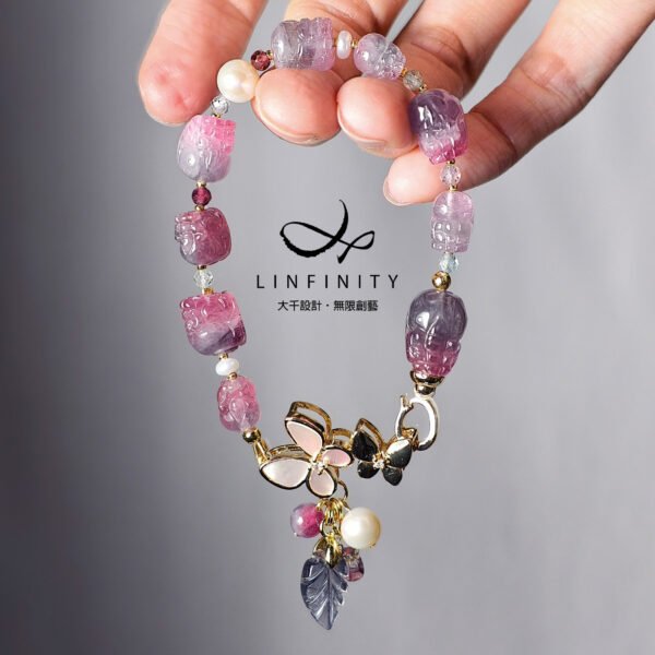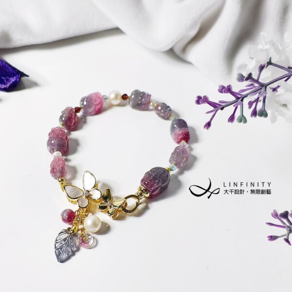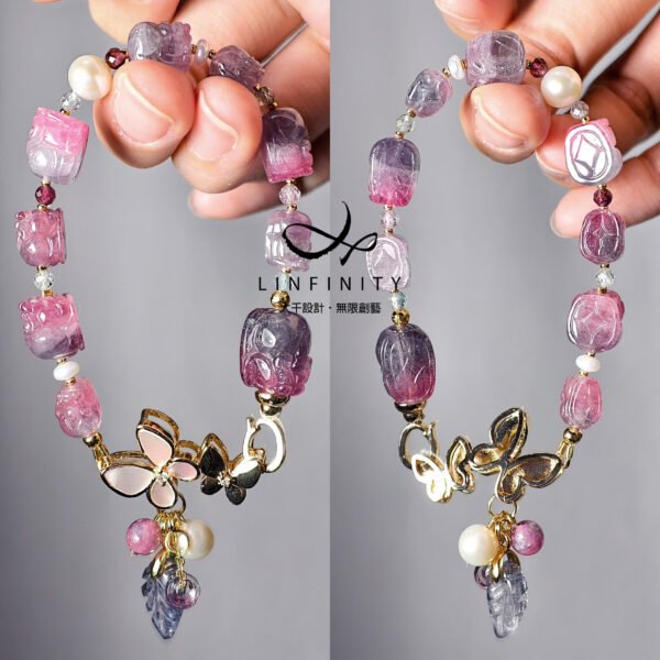 呼應碧璽的繽紛色彩,特選閃耀虹彩光澤的天然蝶貝鑲製成蝴蝶造型黃K金釦飾,並細緻點綴珍珠。珍珠溫潤柔和的光感,為整體紅、紫、藍交織的色彩關係注入低彩度的莫蘭迪美學,使作品在華麗之中更顯內斂、沉穩與優雅。