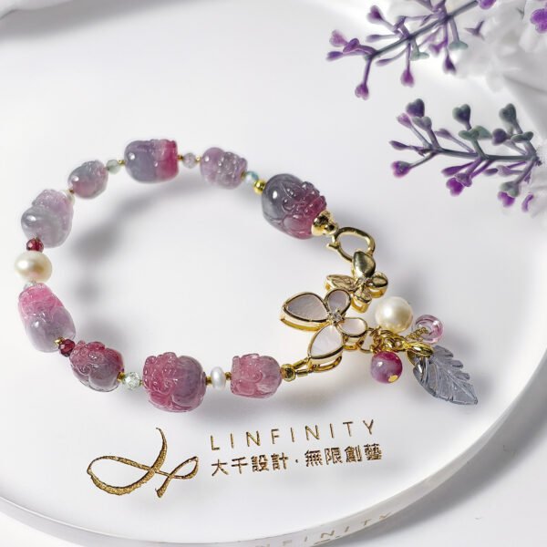全件以藍西瓜碧璽精工雕製 9 只貔貅(招財致富、身懷絕技、各有所長),主墜為紫碧璽雕葉(一葉成功、一葉致富),藍西瓜碧璽古錢(一元復始、萬象更新),整體意涵圓融而豐盛。