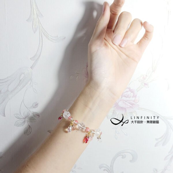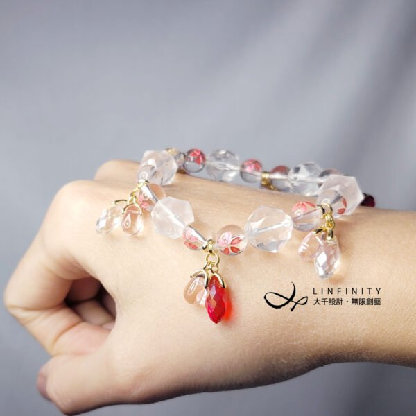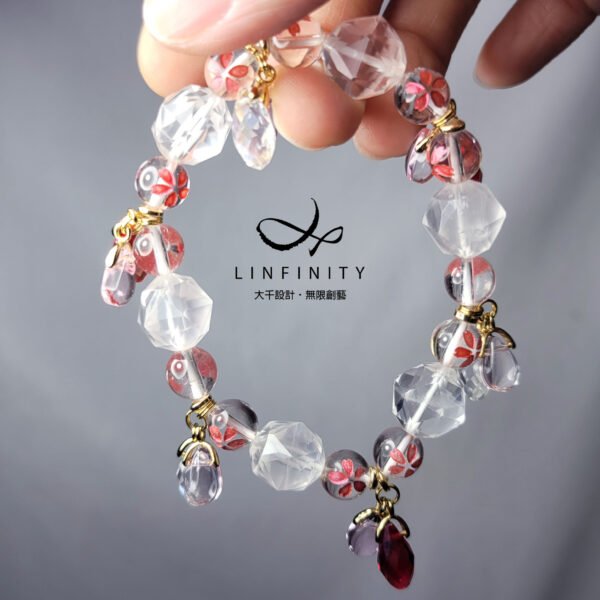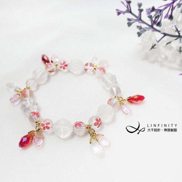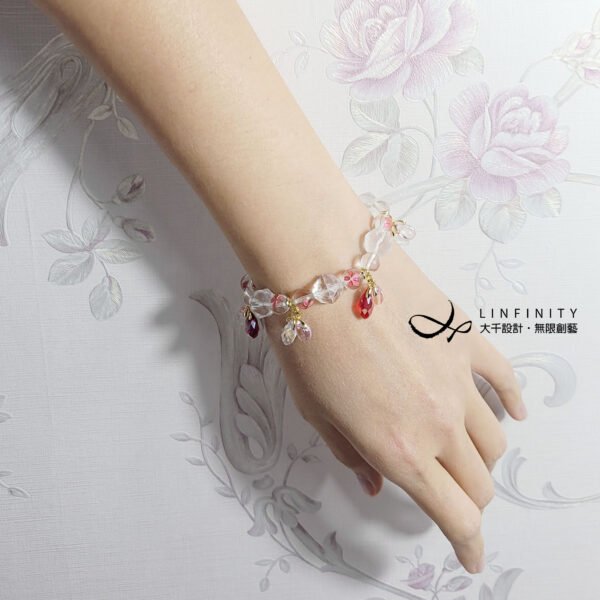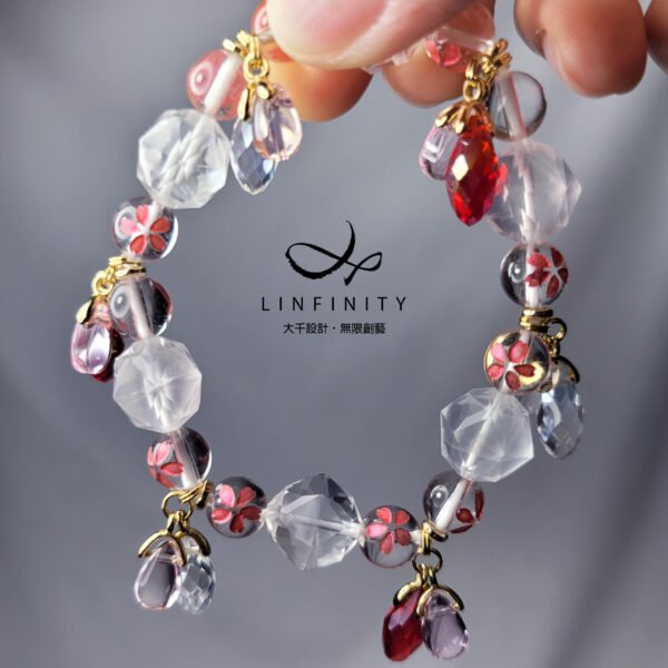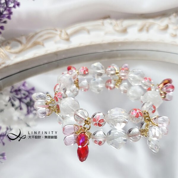 鍊身點綴以白、紅、粉、不同造型、切工之萊茵石,整體清透靈動、活潑亮麗,似落櫻繽紛,初春來臨,一年以紅運當頭之姿起始,福氣吉祥^^。