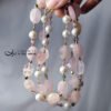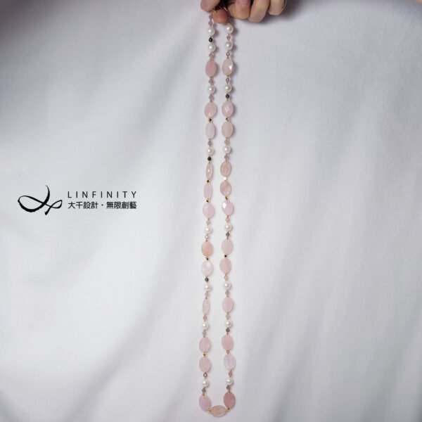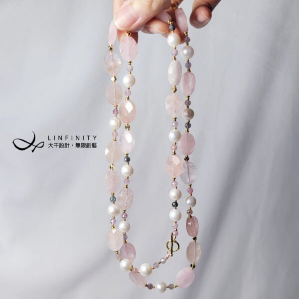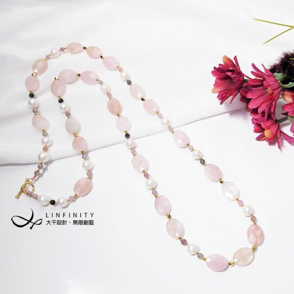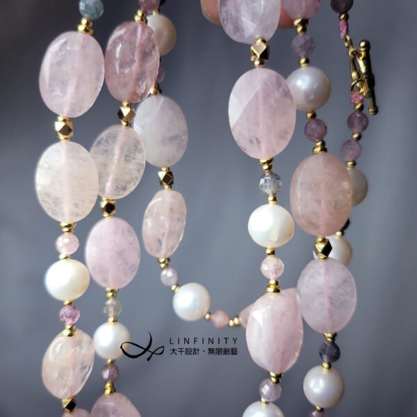 摩根石與尖晶石為鑽面磨切,珍珠為自然原生態(可見天然礦缺),絲綢光閃現、溫潤淨白。整體寶石水光透亮、色調柔美,設計時尚大器、富有韻律感,滿溢春夏氣息,優雅細膩環繞胸前,展現女性柔美婉約、華麗富貴之情。