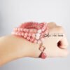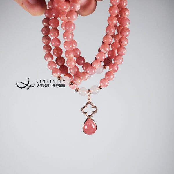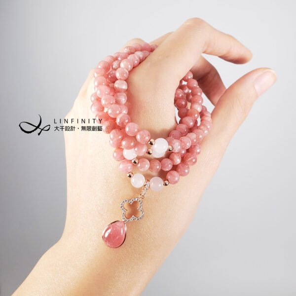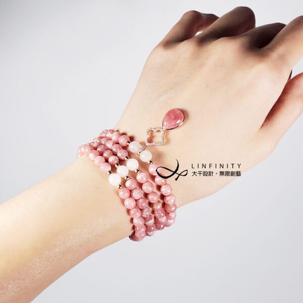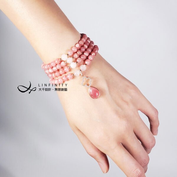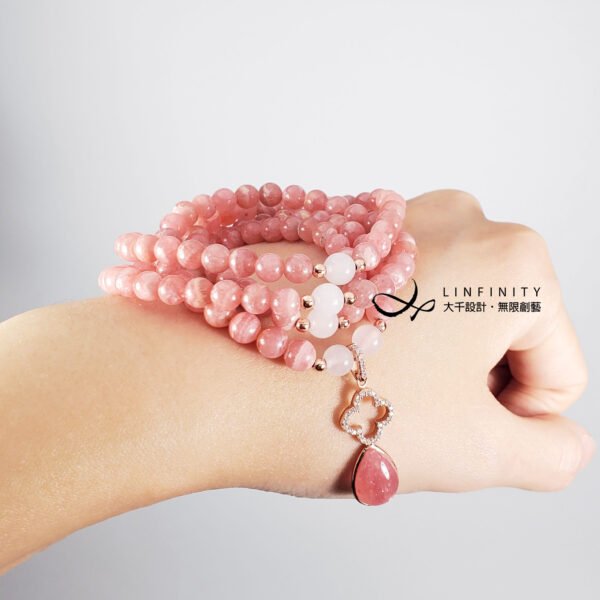 嚴選冰種粉嫩柔亮紅紋石(菱錳礦)精工編製,優雅細緻,上手冰涼滑順、能量溫和而舒適,為招桃花、好人緣必備。