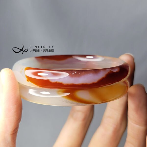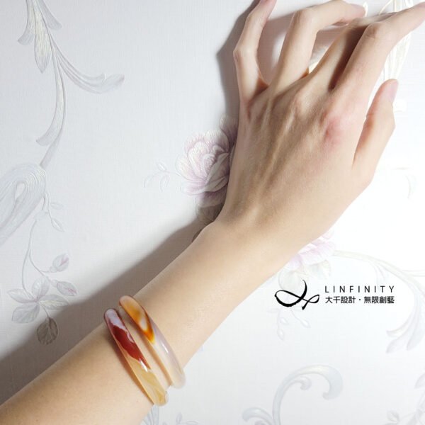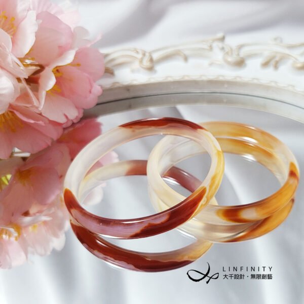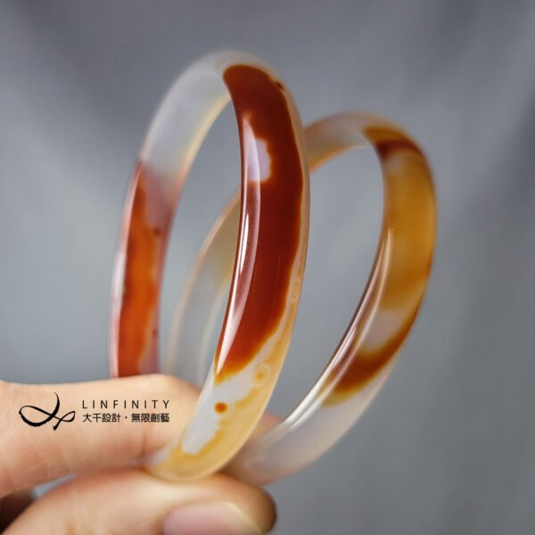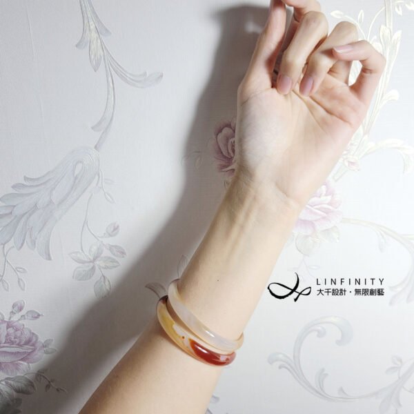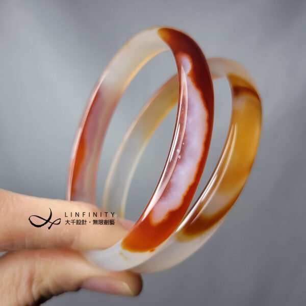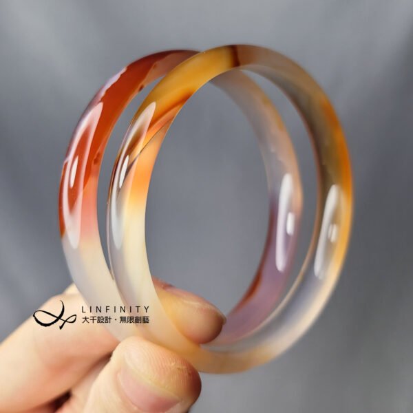 嚴選頂級冰種纏絲瑪瑙(玉瓍),紅、橙、白色彩交織細膩,水光冰潤勻淨、起瑩范光,無裂、無斑點,2只一組為叮噹鐲,匠心獨具,品相極美。