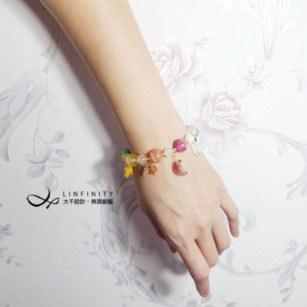 墜飾蘊含吉祥寓意之造型(月亮-靈性智慧,花-開富貴心,古錢-招財、平安,竹節-節節高升、高風亮節,心-心想事成,海星-吉星高照,水滴-富貴,柱-中流砥柱、玉柱擎天)。