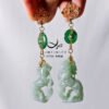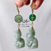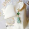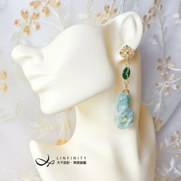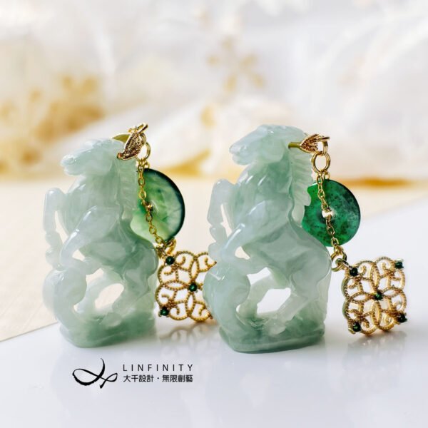 駿馬上點綴帝王綠翡翠雕古錢、古典窗花造型耳針,寓意馬上有錢花,吉祥討喜,值得收藏。