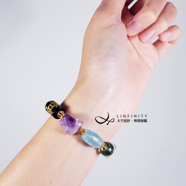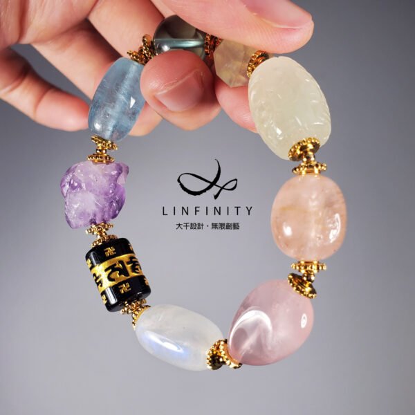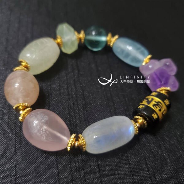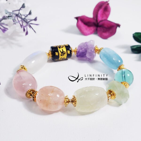 結合時下流行的彩虹元素、五行概念、蘊含吉祥寓意之六字真言、富貴回紋,使多寶釧兼具傳統多種寶石的豐富度、與現代首飾的時尚造型感,搭配性屬飾品中最高者,相當百搭,並且每一個角度都美的獨一無二。