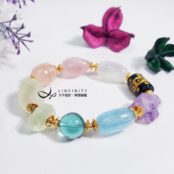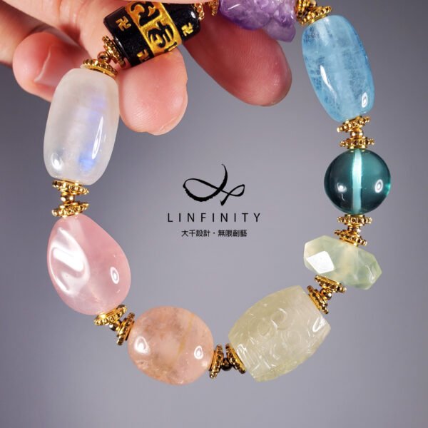 材質:天然粉晶、橘摩根石、金海藍寶、葡萄石、綠曜石、海藍寶、紫水晶、黑瑪瑙、藍暈月光石、925銀、18K金