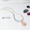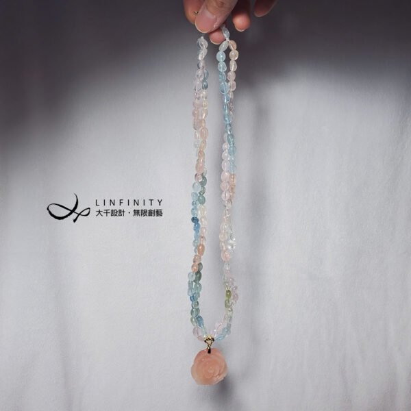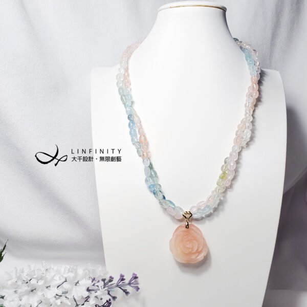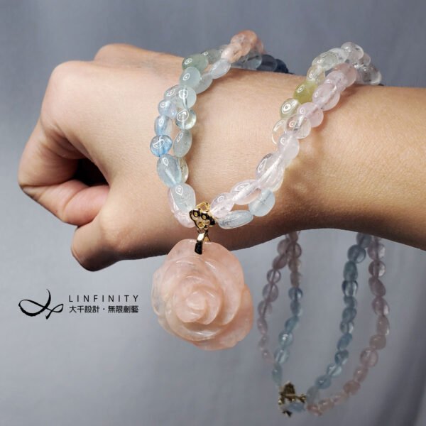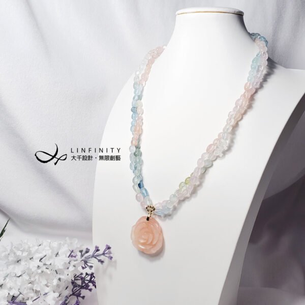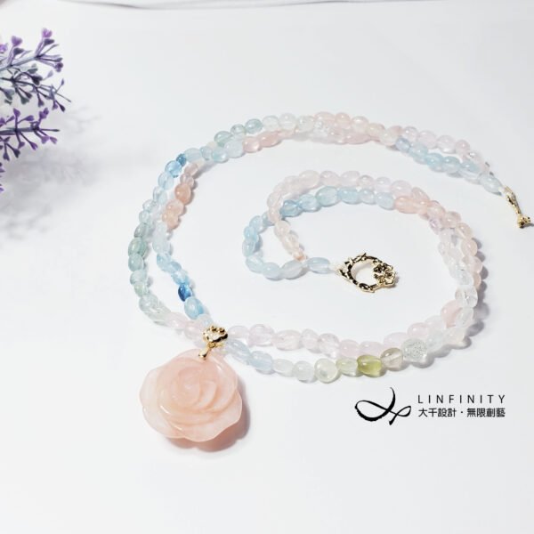 嚴選頂級綠柱石(海藍寶、摩根石),精工雕製富貴玫瑰花、隨型珠飾,寶石水光透亮、色調柔美,以如意墜頭點綴玫瑰花,編製繽紛彩虹馬卡龍色2股鍊身(微旋轉2股鍊身後配戴更美),優雅細膩環繞胸前,展現女性柔美婉約、華麗浪漫之情。