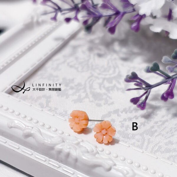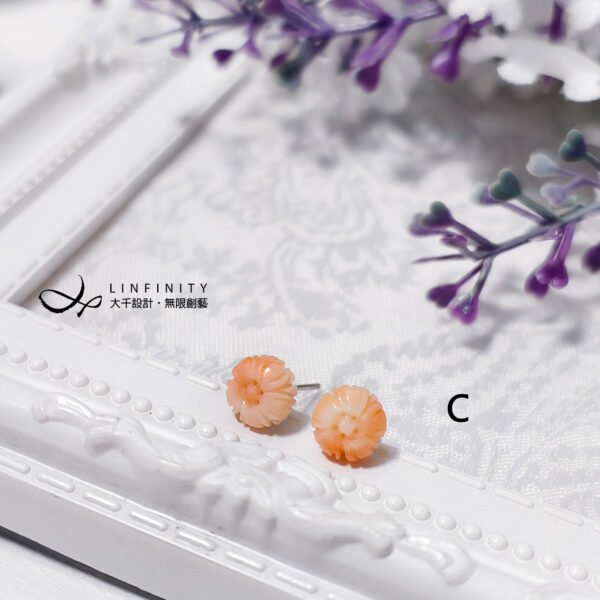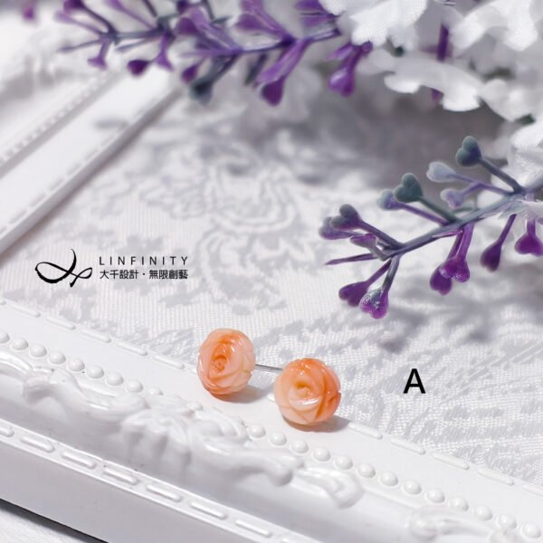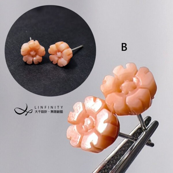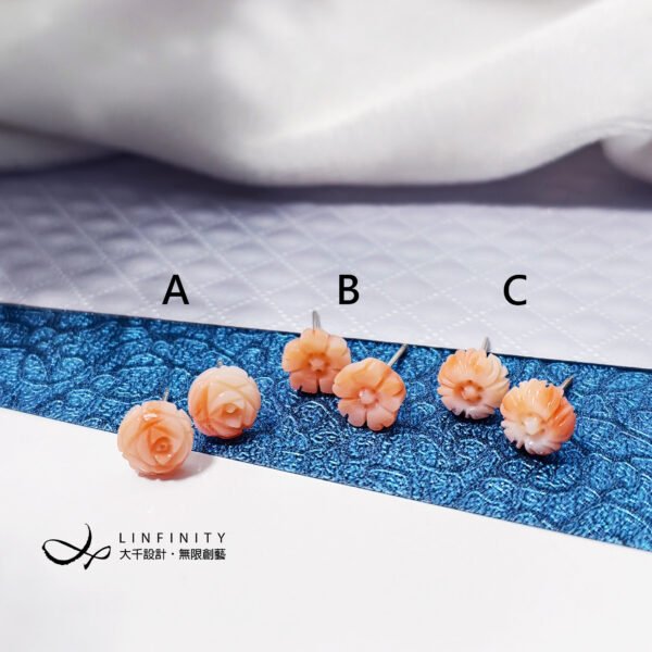 嚴選名貴有機寶石 – 台灣粉珊瑚,精工雕製典雅富貴玫瑰、櫻花、菊花,相佐925純銀耳針。