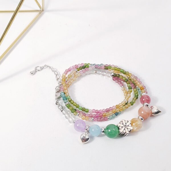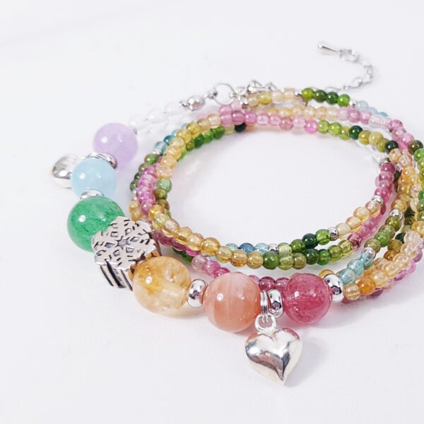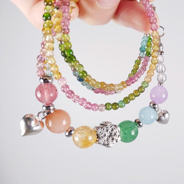 嚴選天然糖果碧璽、多種彩色寶石,精工編製,清透亮麗、細緻優雅,相佐銀雪花飾,讓(你)妳成為嚴寒冬季裡最繽紛的風景。