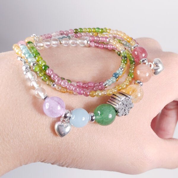 材質:天然彩虹糖果碧璽、草莓晶、太陽石、黃水晶、綠草莓晶、海藍寶、薰衣草紫水晶、白水晶、925銀、18K金