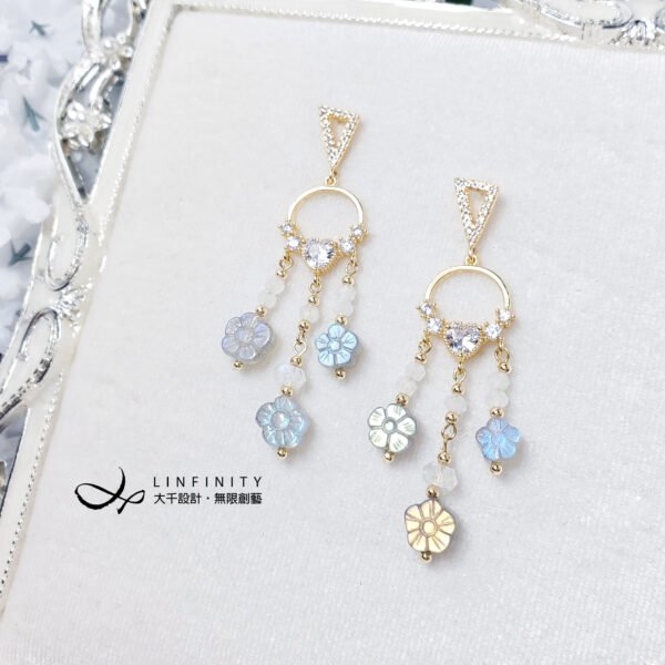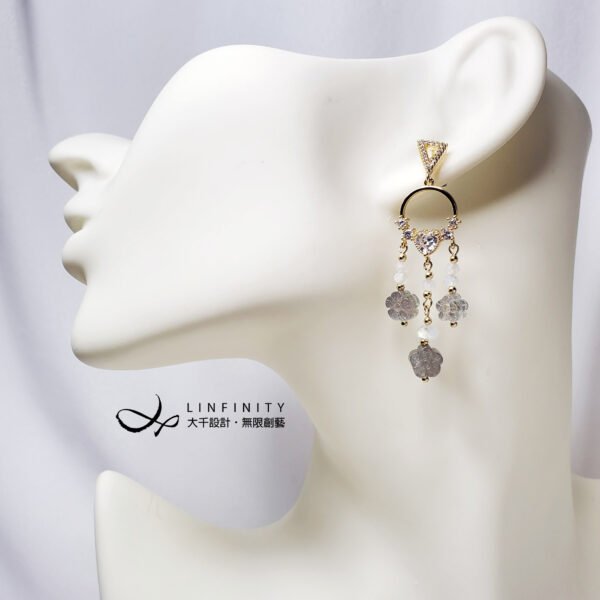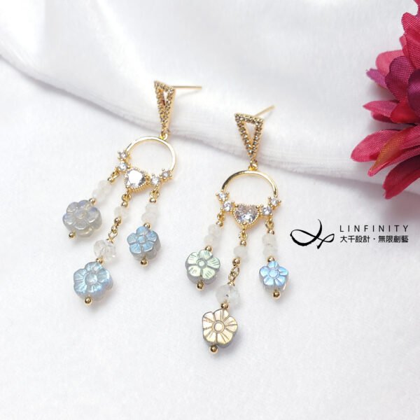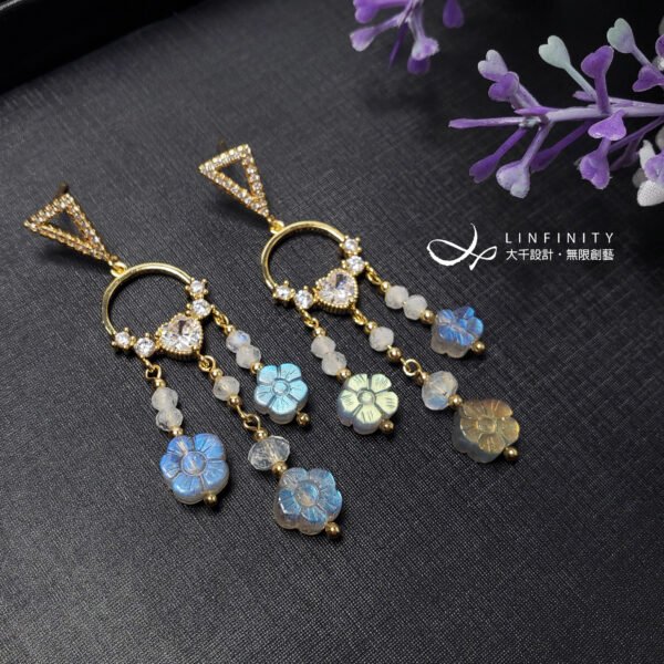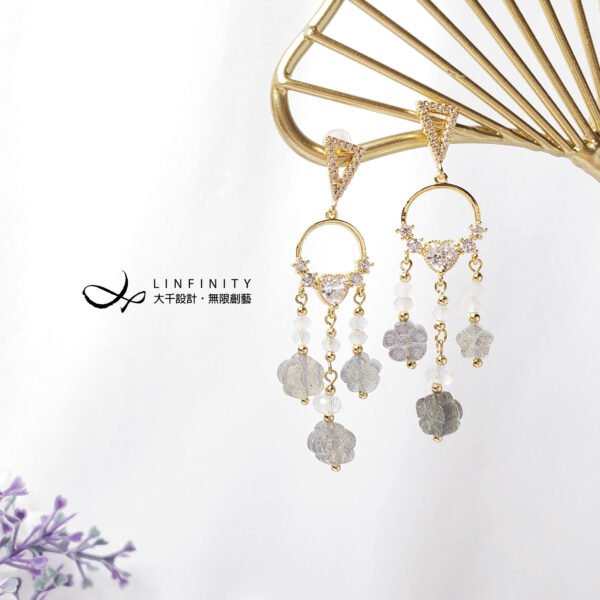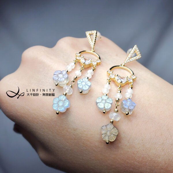 嚴選兩面彩虹光、淨體之灰月光石花朵,相佐藍暈月光石,編製典雅華麗流蘇造型耳飾,搖曳生姿,寶石閃現拉長石家族獨有彩虹絲綢光暈,體現古典、時尚融合的風韻。