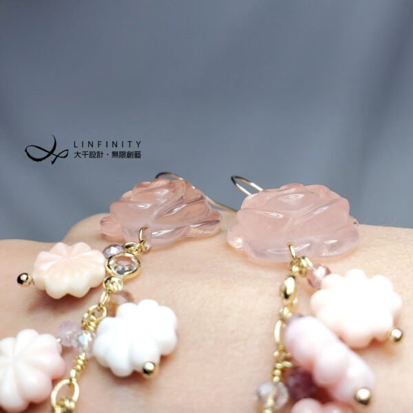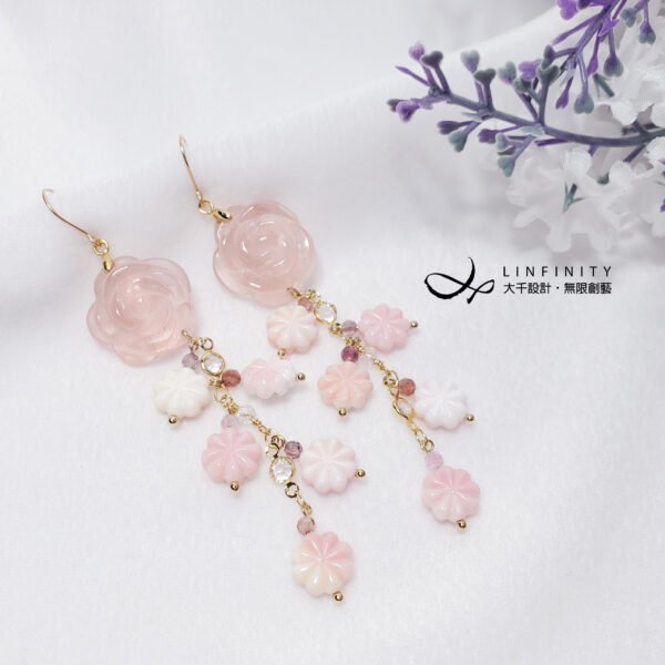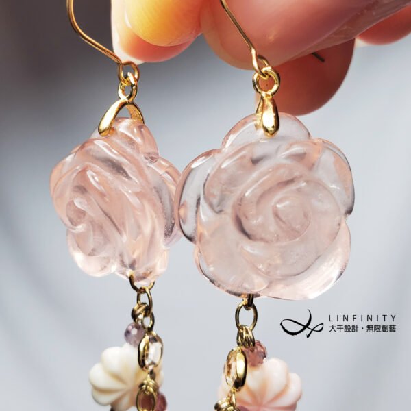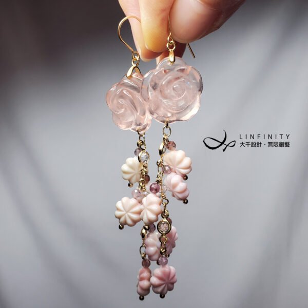 嚴選星光粉晶雕製玫瑰,佐靈性有機寶石女皇貝花朵、彩色尖晶石編製華美流蘇,寶石水光勻淨、色澤水潤、無斑點礦缺、瓷化程度高(女皇貝),整體富貴華麗,古典風情與現代時尚兼備。