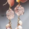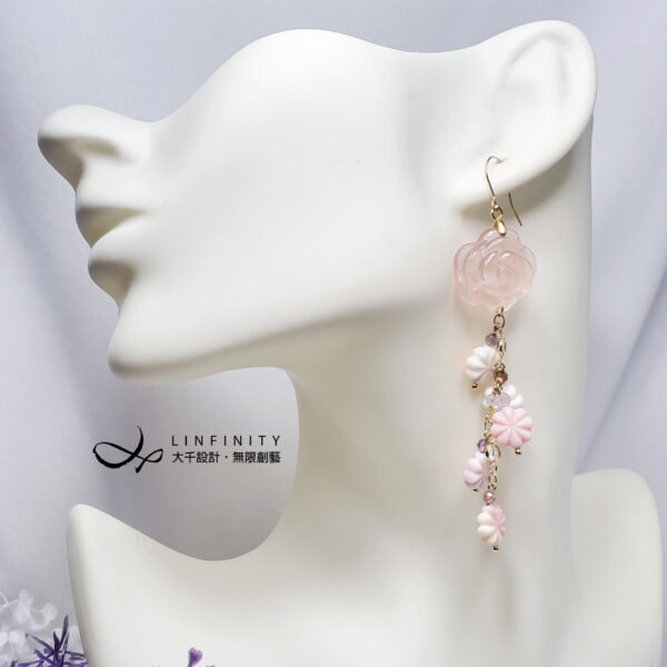 尺寸:粉晶玫瑰高約20.5mm、厚9.4mm,女皇貝花約1cm,總高含耳針約9.3cm,可改夾式。