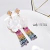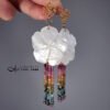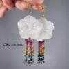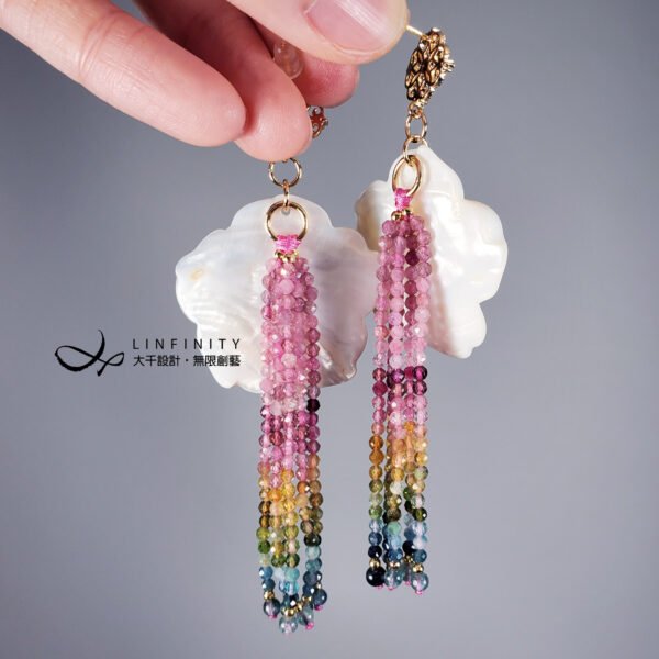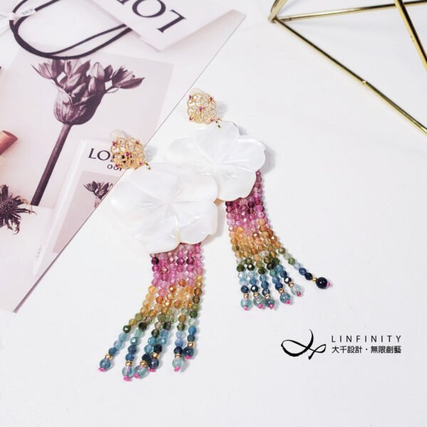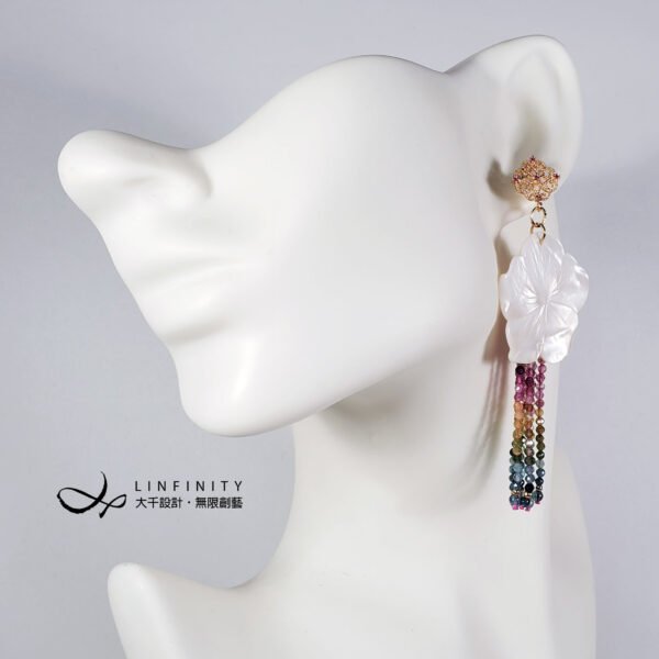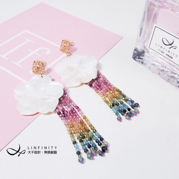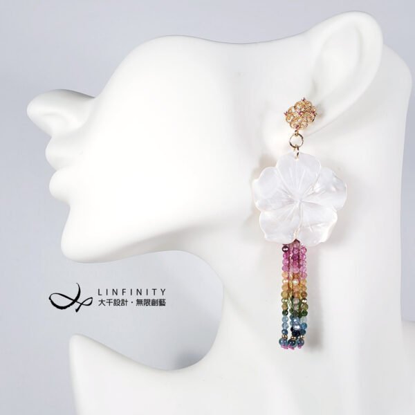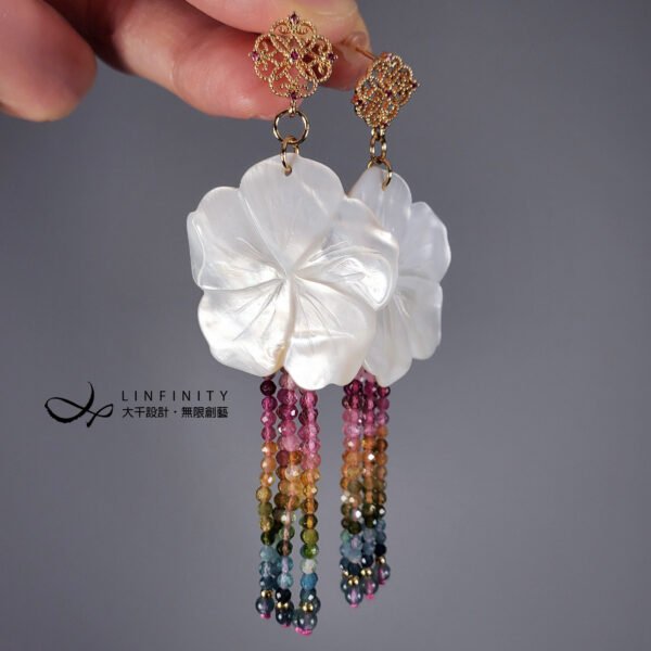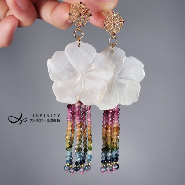 嚴選閃現迷人夢幻色彩的珍珠母貝,巧雕華美大器花朵,相佐顏色豐富、蘊藏七彩能量的碧璽流蘇,結合吉祥花草紋飾耳針,富含古典風情,優雅氣質立現。