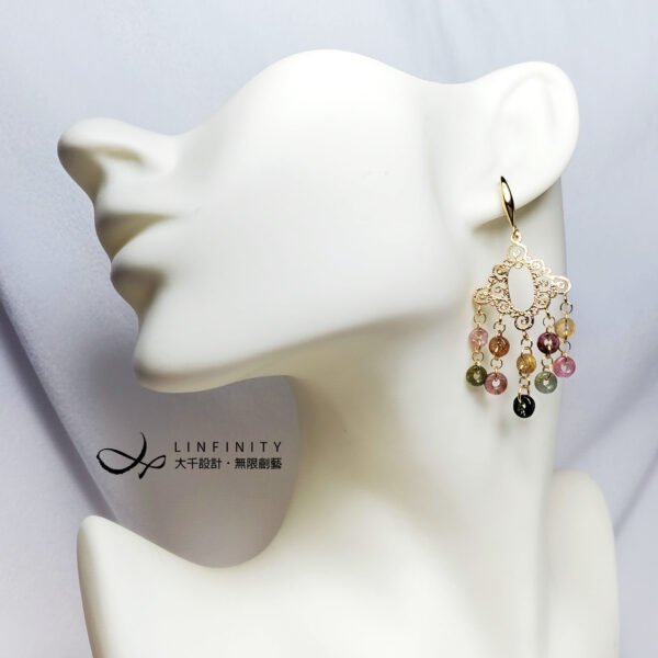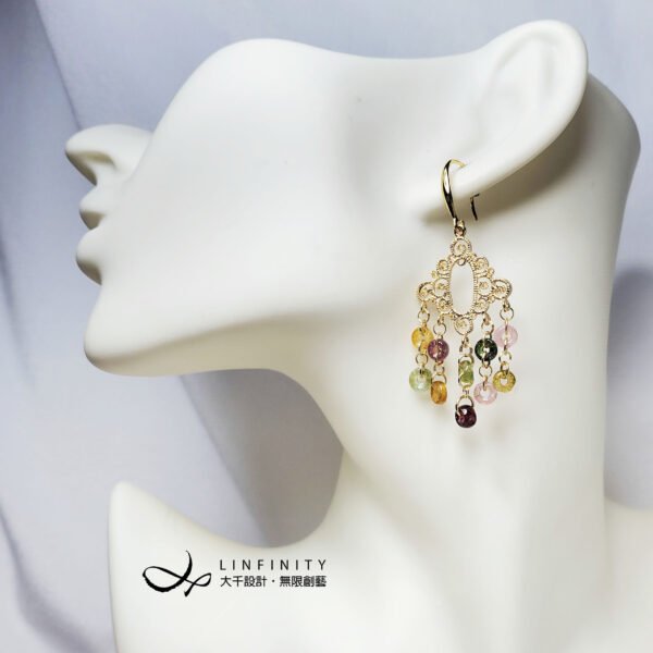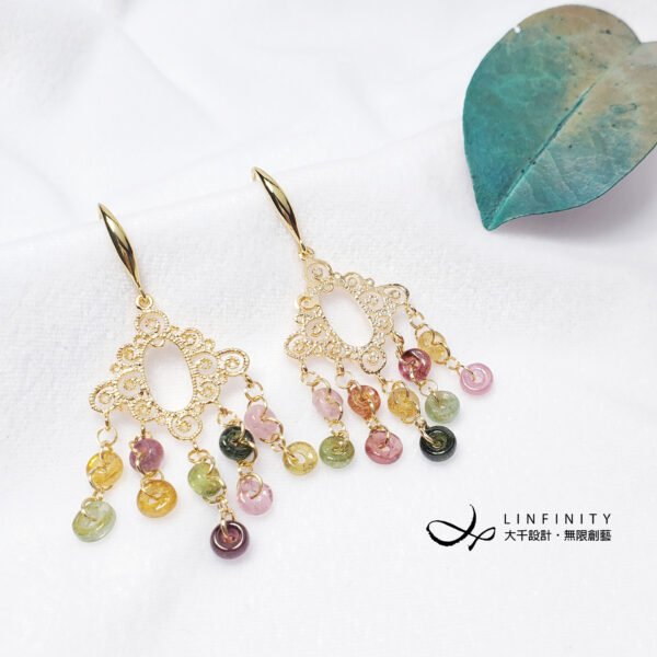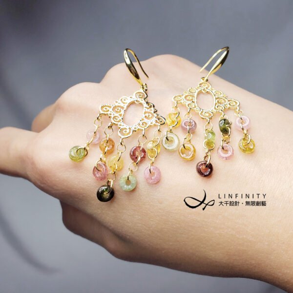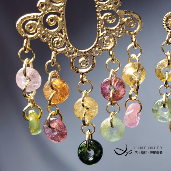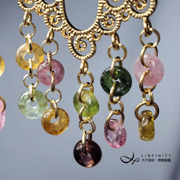 嚴選頂級彩色碧璽,精工磨製平安扣(古錢,招財)珠飾,10只平安扣有十全十美之意。寶石顆顆淨透無瑕、色彩勻淨、火彩閃耀,精工編製流蘇造型時尚亮麗、細緻優雅、寓意吉祥。