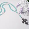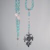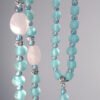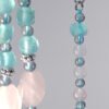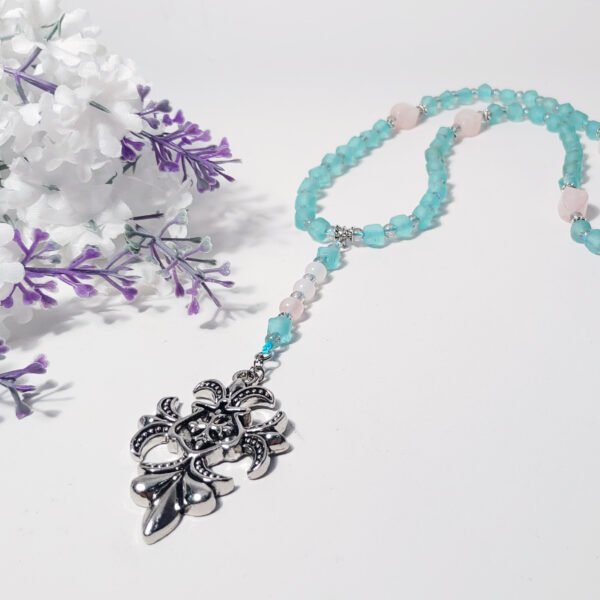 如海水般澈藍、舒心的藍琉璃、絲綢光藍暈拉長石,相佐柔美粉晶、捲草紋飾十字架,能量相當柔和、靜謐。