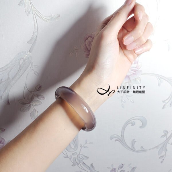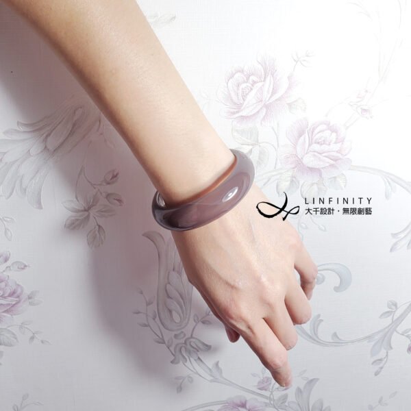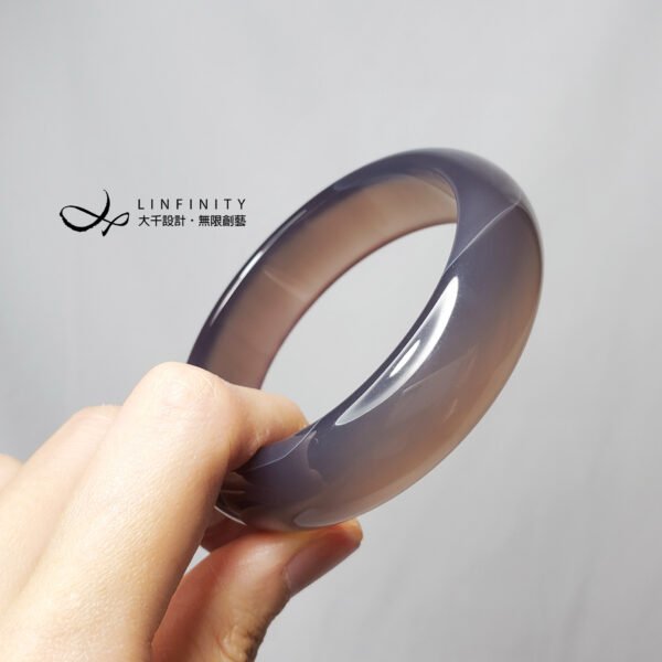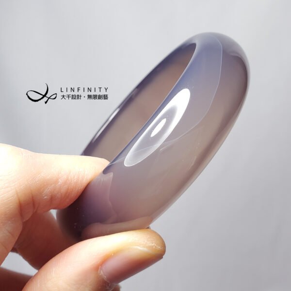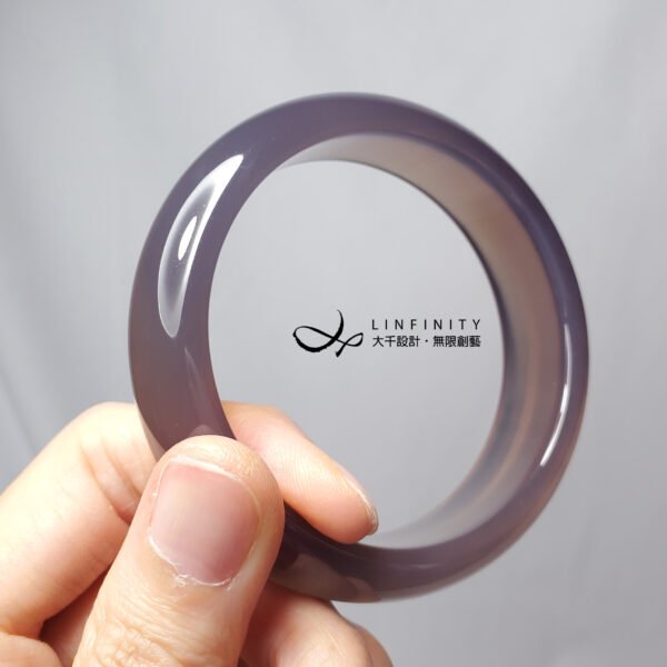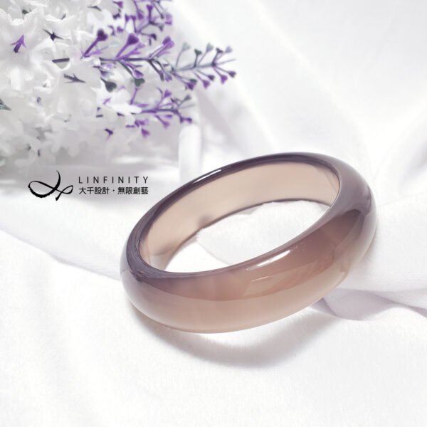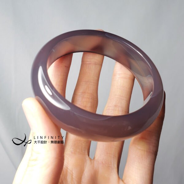 嚴選高檔紫玉瓍(紫瑪瑙),水光勻淨清澈、細膩溫潤,無裂、無斑點,並帶有一縷天然絲狀紋理,不同光線角度下呈現自然紫色漸變光澤,極其優美,版寬而厚,大器華美非凡。