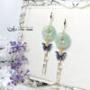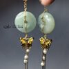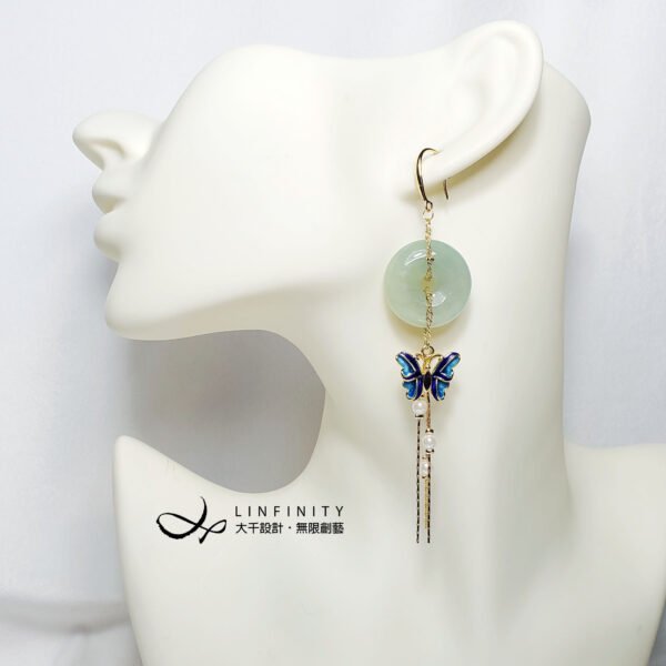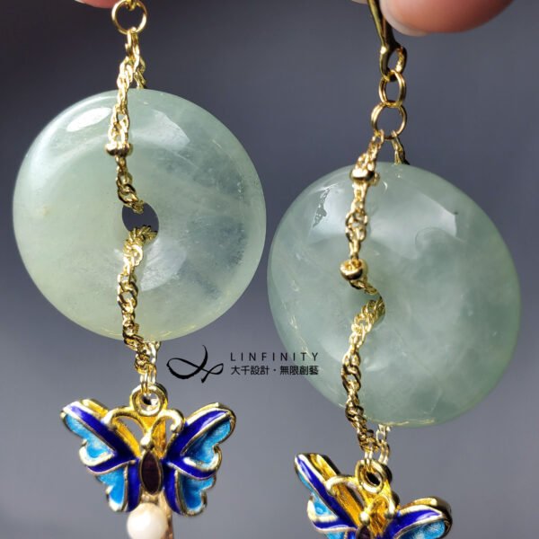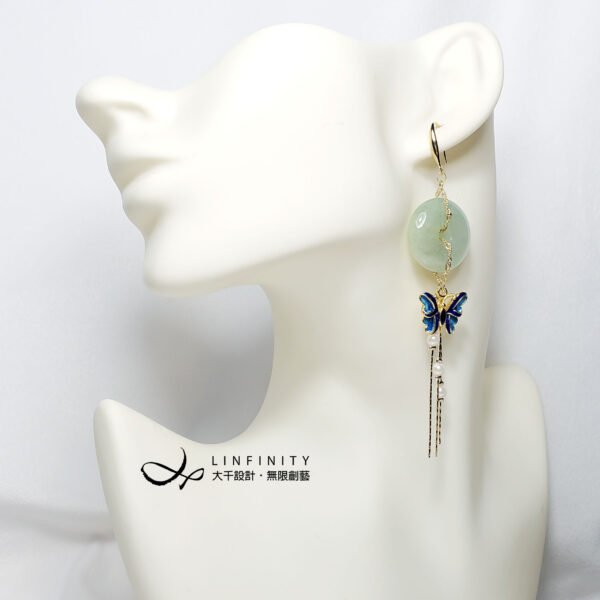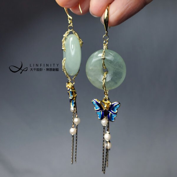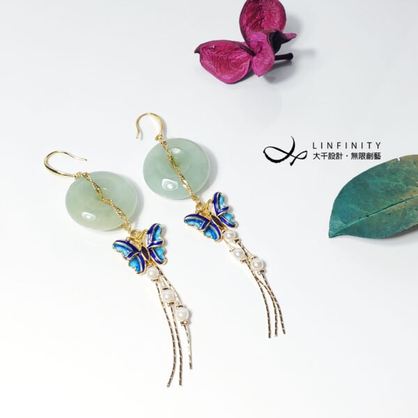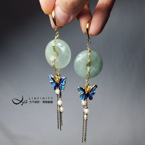 嚴選珍貴稀有的綠海藍寶(綠柱石、祖母綠),雕製圓潤厚體平安扣(古錢),寶石溫潤青蘋果光澤,水光勻淨,以K金鍊佐富麗蝴蝶(福氣)琺瑯、珍珠流蘇造型,極其靈動優雅,富含古典風韻,兼具時尚美麗。