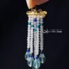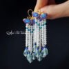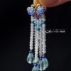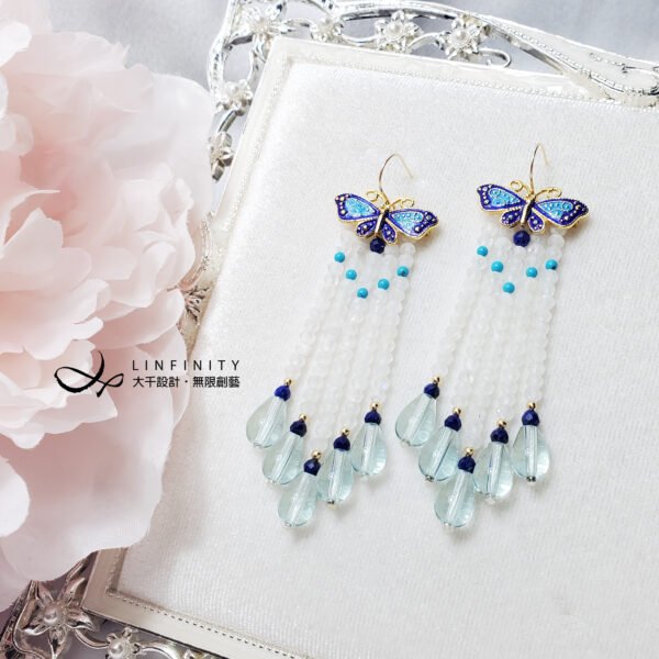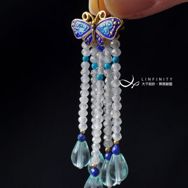 嚴選淨體藍暈月光石,鑽面磨製、體淨閃耀無斑點,佐福氣琺瑯蝴蝶飾,精工編製排狀流蘇,點綴以頂級高瓷藍松石、帝王青青金石、淨透藍水滴琉璃,造型典雅富貴、華美大器。