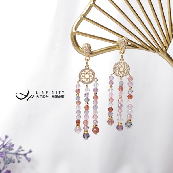 嚴選天然頂級尖晶石,鑽面磨製閃耀珠飾,寶石彩度高、水光閃耀、晶體淨透,相佐捕夢網編製流蘇,是為吉祥、平安、好運之美物^^。