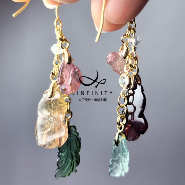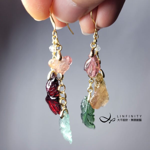 嚴選頂級彩色碧璽,精工巧雕靈動金魚(金玉滿堂)、如意(如人所意)、葉(一葉成功),編製多寶釧(所願皆成)優雅流蘇造型,寶石淨透無瑕、色彩勻淨、火彩閃耀,為寓意吉祥、造型極其優美之臻品^^。