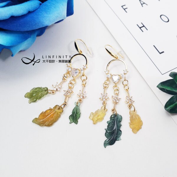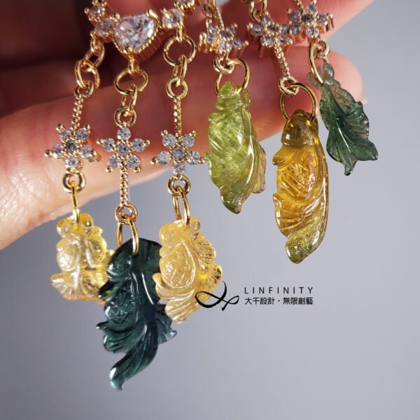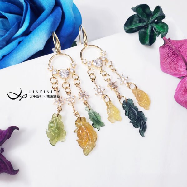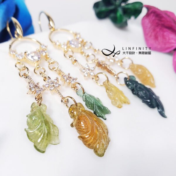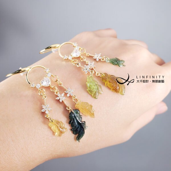嚴選產量珍稀之金碧璽、綠碧璽、與帶藍色調之綠碧璽,巧雕靈動優美之金魚,淨透無瑕、色彩勻淨、火彩閃耀,富涵古典氣息,細膩別緻的點綴女性耳際。