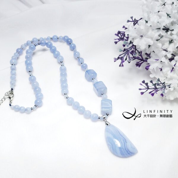 藍紋瑪瑙(Blue Lace Agate)礦物中的微量銅鹽令晶石顯露美麗的藍色、淺藍、白色紋理,細膩雅緻。