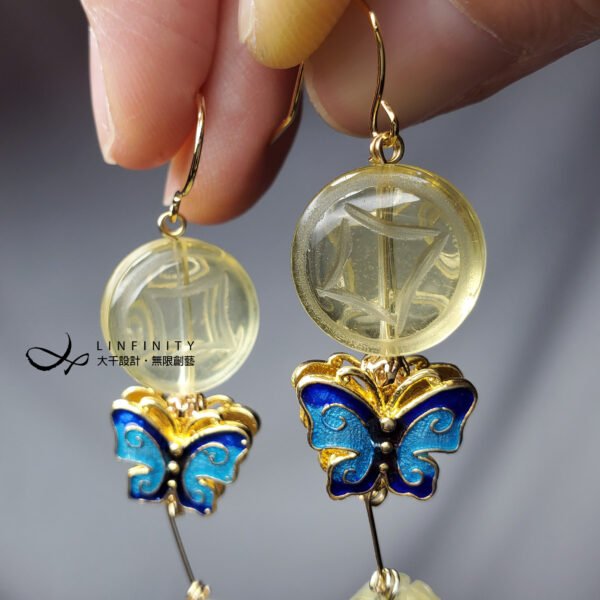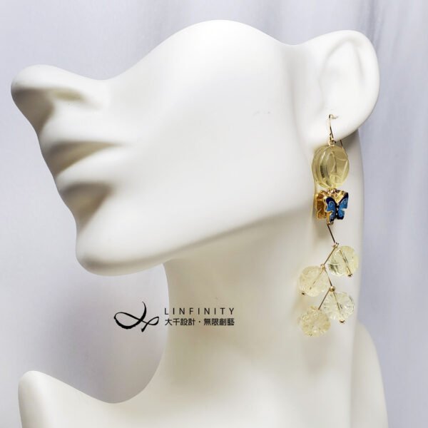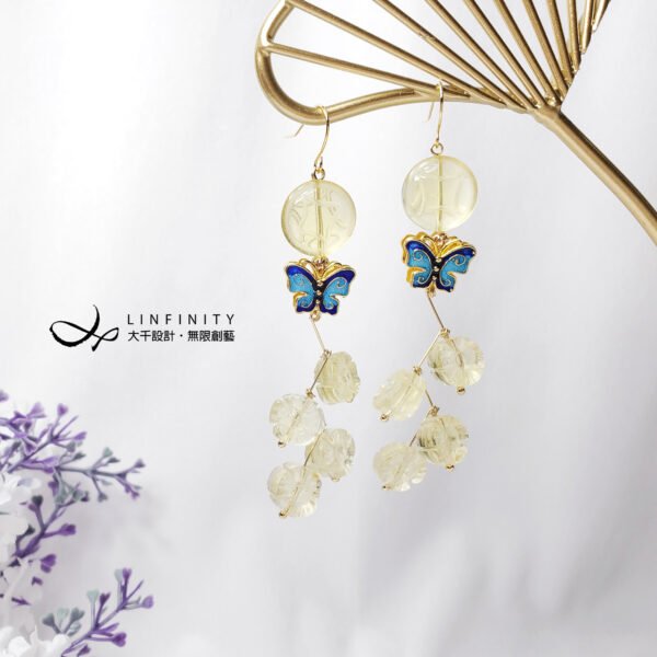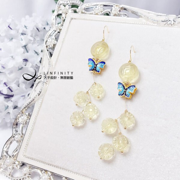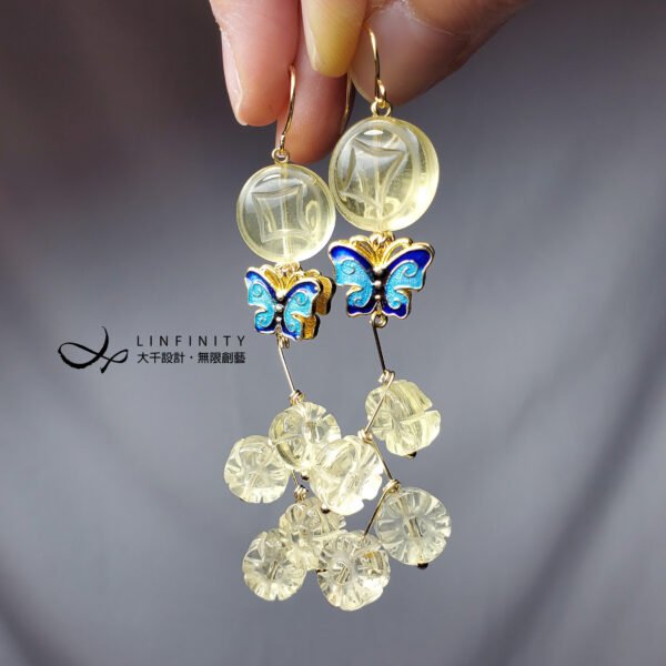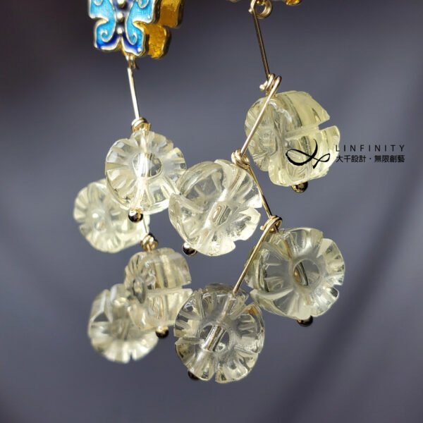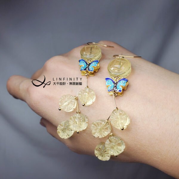 嚴選頂級財富之石-黃水晶,精工雕製古錢(一元復始)、花(花開富貴)造型,相佐富貴琺瑯蝴蝶(福氣)飾,大器典雅、亮麗上身,是為開運、招財之好物。