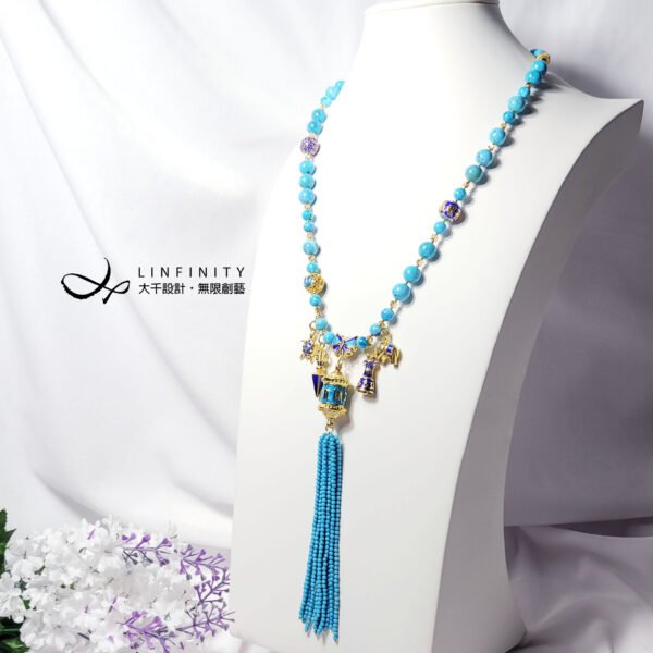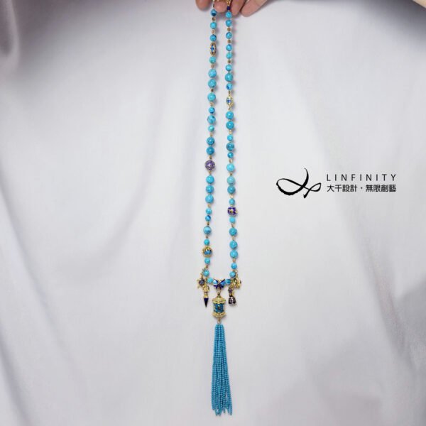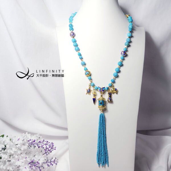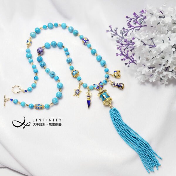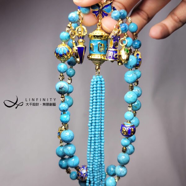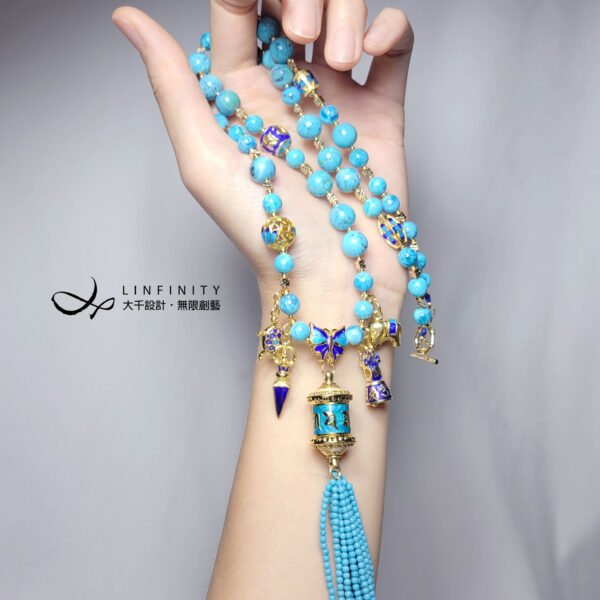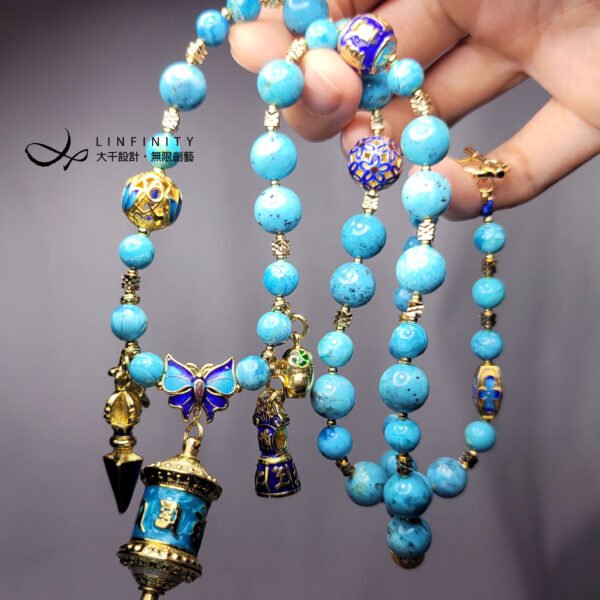 嚴選琺瑯工藝製極佳之六字真言轉經輪,軸承順滑度極高(轉動極順),相佐鳳凰石(藍銅礦共生藍松石)、富貴吉祥琺瑯(蝴蝶-福氣,金剛鈴杵-智慧,大象-太平有象,烏龜-長壽健康,蓮花-清淨智慧)飾設計,是為清淨祈願、吉祥富貴、別緻高雅、氣宇非凡之美物。