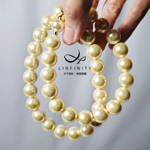 貝珠12mm,顆顆溫潤、金光燦燦,大器十足。