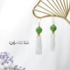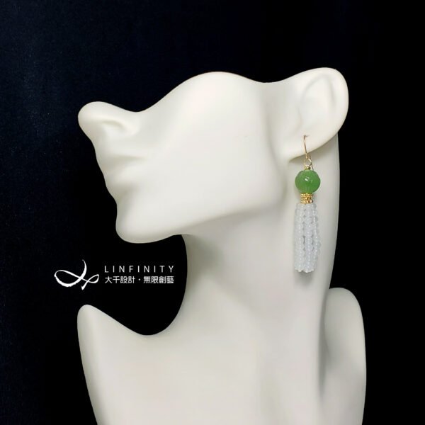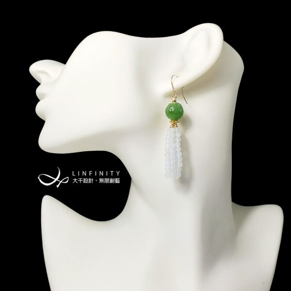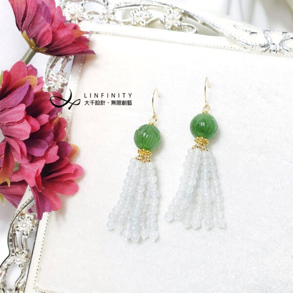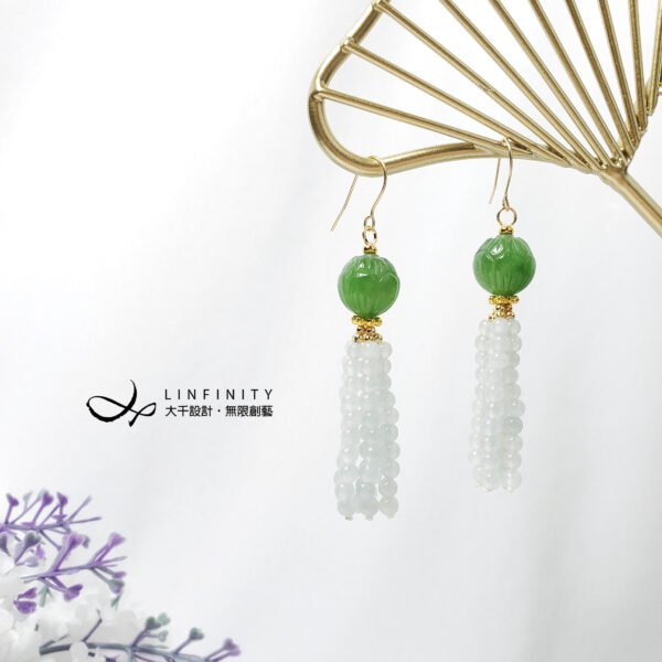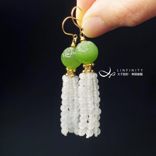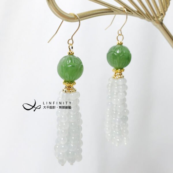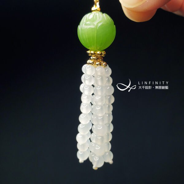嚴選天然和闐碧玉,精雕圓潤飽滿智慧蓮花,相佐冰種白翡編流蘇,碧玉翠碧色高雅水潤,白翡起螢放光效果極佳,通體色彩勻淨、水光盈潤,雅緻大器,極富古典風情。