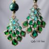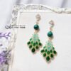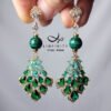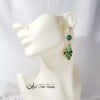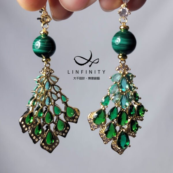 萊茵石(琉璃、水晶玻璃、水鑽)湖水綠、翠綠,與孔雀石的艷綠相互掩映、富貴大器。萊茵石鑽面切工閃耀奪目,以K金工藝精緻包鑲(爪鑲),整體大器、富貴、華美。