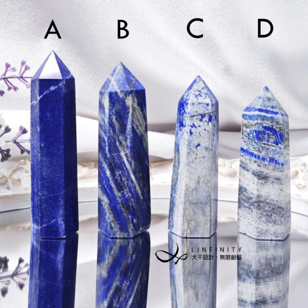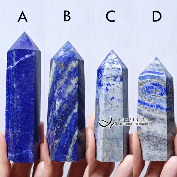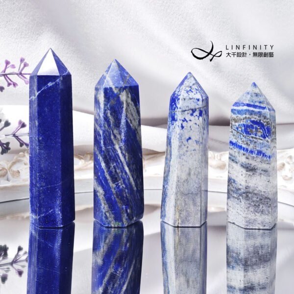 設計師在偌大的工廠中、千萬支的晶柱中,持恭敬心、高規親選4款青金石,每一件皆展現青金石的經典藍、白、金紋理,這些紋理,時而層層堆疊、層次分明,時而點點分布、宛若飛雪,風格獨具,萬中選一。