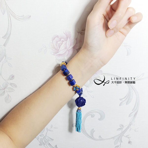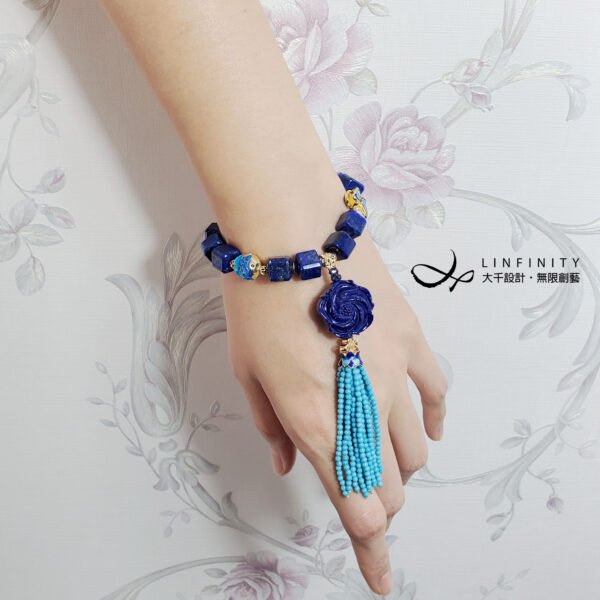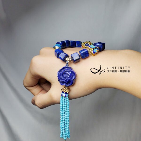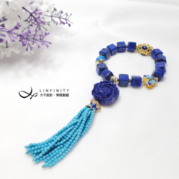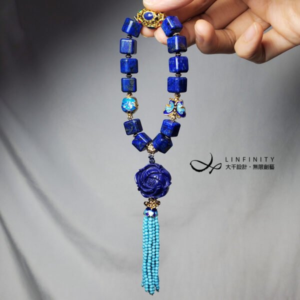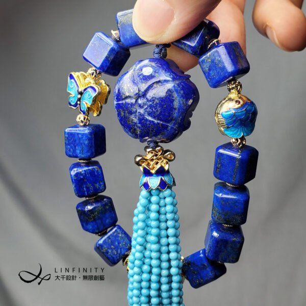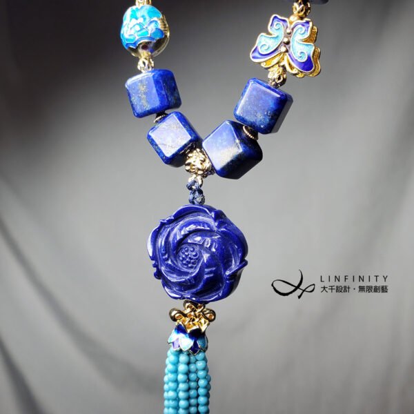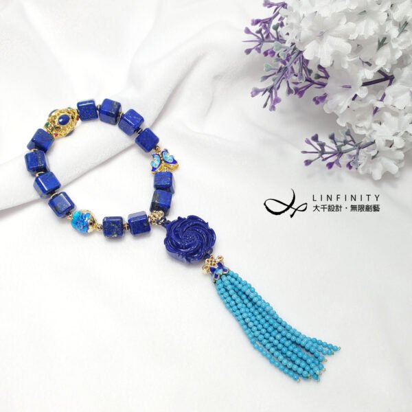 嚴選歷代帝王祭天禮石-青金石,精工雕以富貴牡丹花、魔方,相佐景泰藍蝴蝶(福氣)、魚(年年有餘),點綴以藍松石流蘇,華美不已,華麗演繹出亙久的寶石能量與美麗紋理。