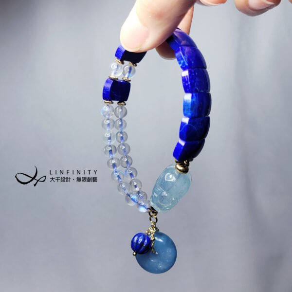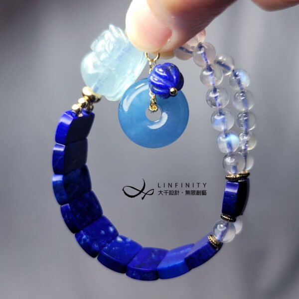 嚴選藍色系寶石中最為著名之-青金石、海藍寶、藍月光石,共同成就本款精品。