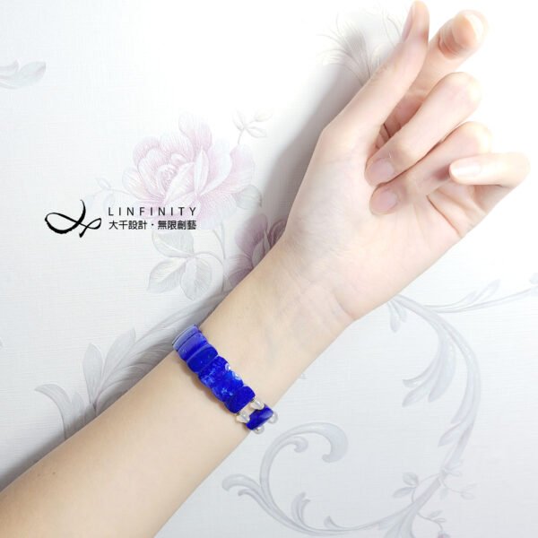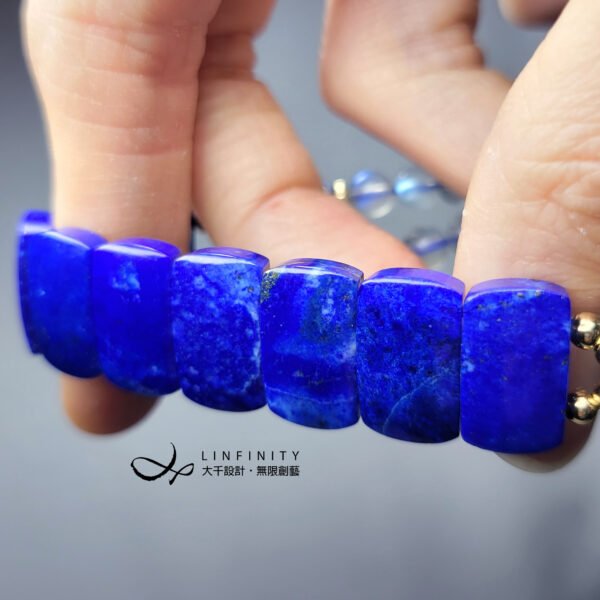 青金石為帝王青品種,色正而艷、正氣十足,金、白分佈細膩之餘,尚十分寫意,宛若星空、白雲、蒼海,每片寶石,時而是海天一色,時而是浩瀚宇宙星空,每片寶石都是風景。