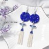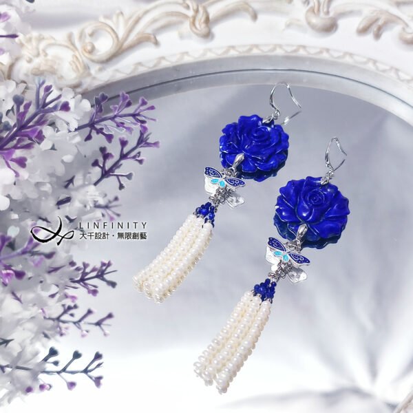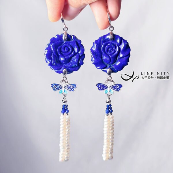 呼應青金石的正氣藍、白色調,以景泰藍蝴蝶為腰封(飾品的中上端位置),其下銜接白淨珍珠流蘇,整體雍容富貴、古典華美,是匠心獨具、千年一遇之美物。