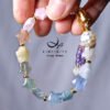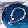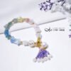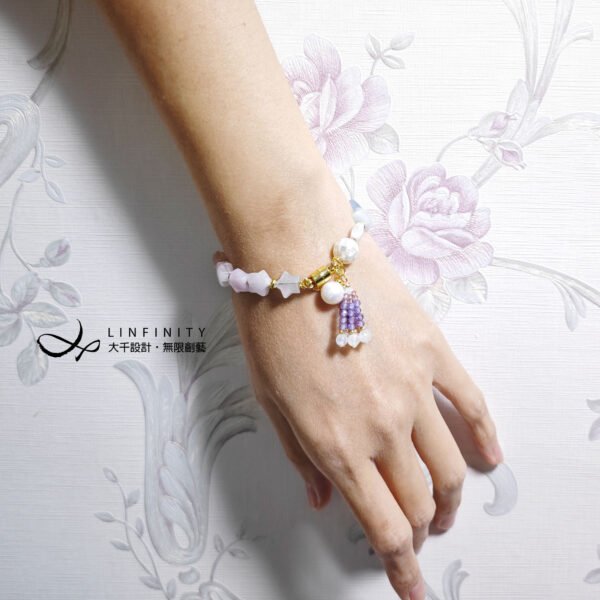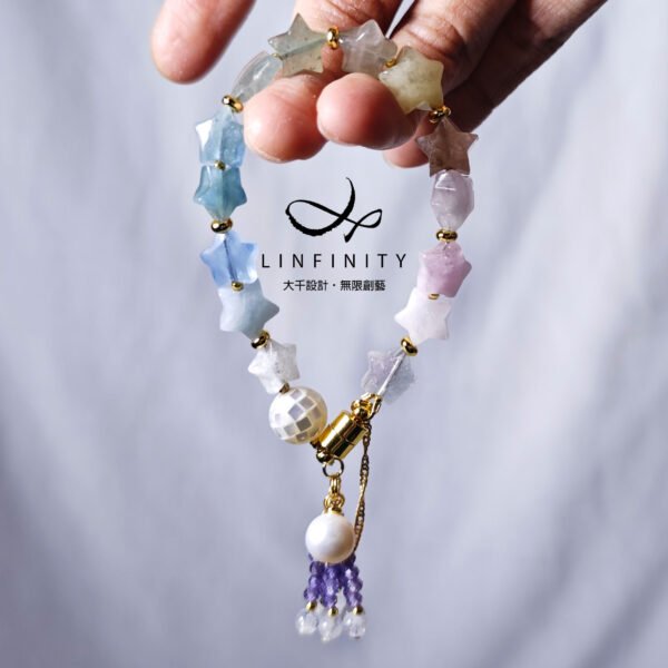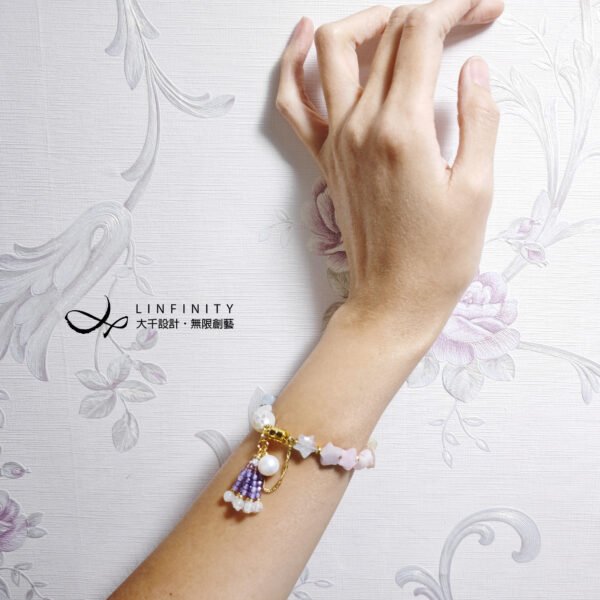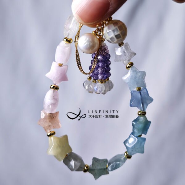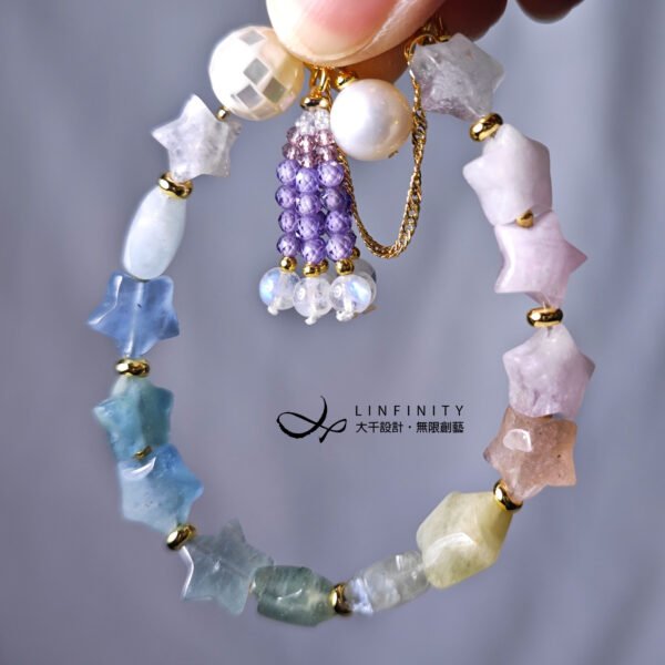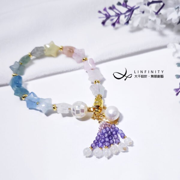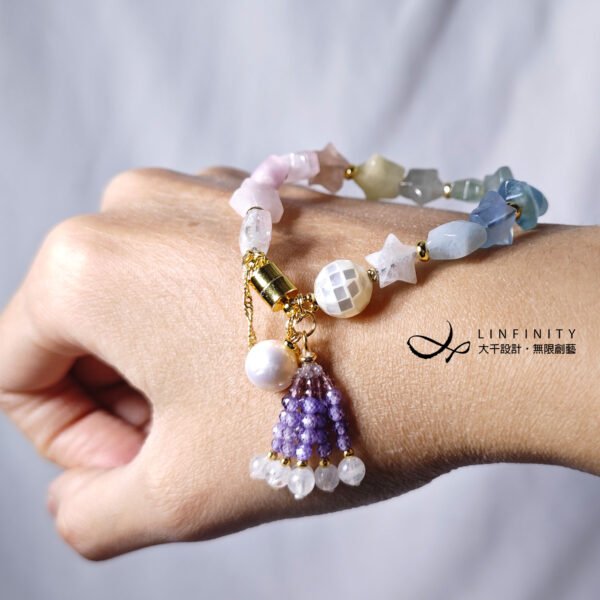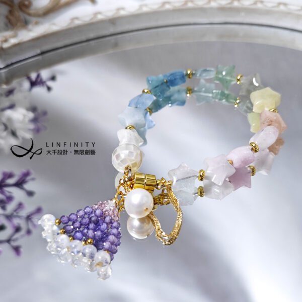 以永恆潔淨的珍珠、螺鈿點綴鍊身與主墜,並精選頂級鑽面紫水晶、藍月光石編製流蘇,成就整體彩虹漸層設計,對應人體七脈輪,優雅環繞手腕,浪漫得不言而喻。
