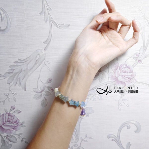1.圖上綠柱石星星寬約10.6mm,螺鈿珠約10mm,紫水晶流蘇高約30mm,為磁吸釦式,手圍15.5cm。