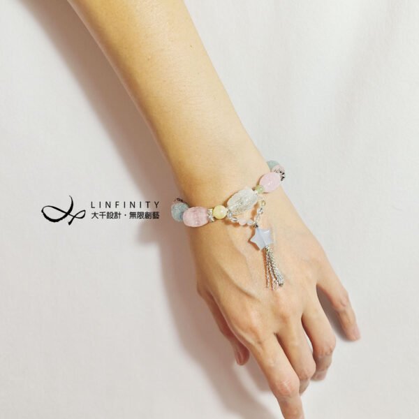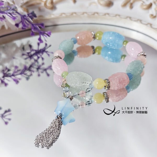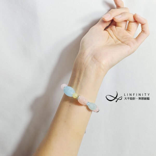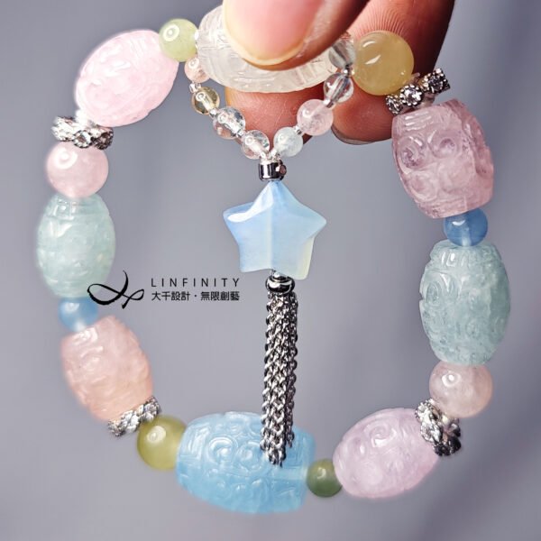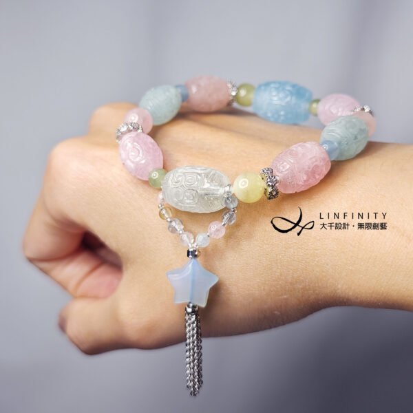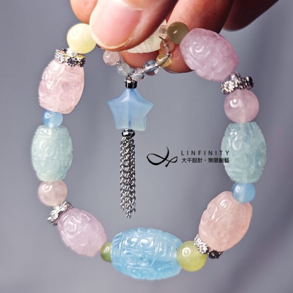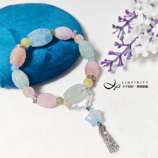 嚴選綠柱石家族所有色系寶石(海藍寶、摩根石),雕以回紋(吉祥無盡)飾,主墜為海藍寶(吉星高照),整體寶石色正、晶體淨透、水光勻淨,優雅環繞手腕,華美浪漫不言而喻。