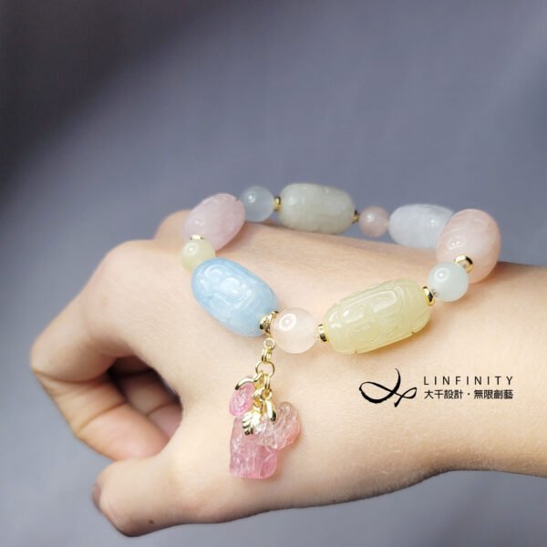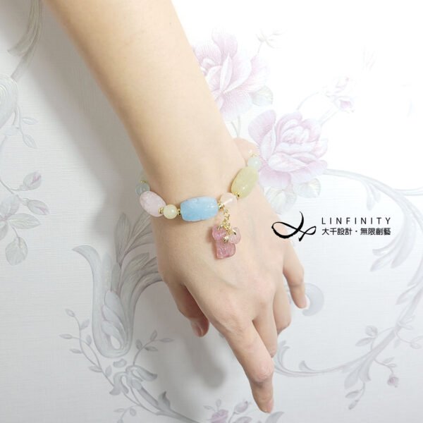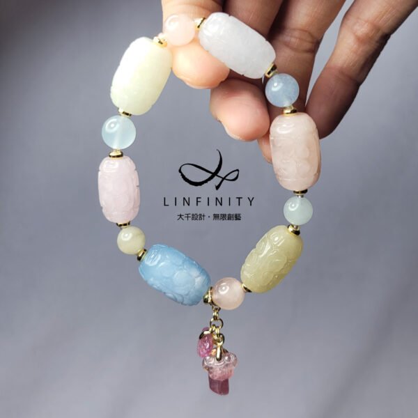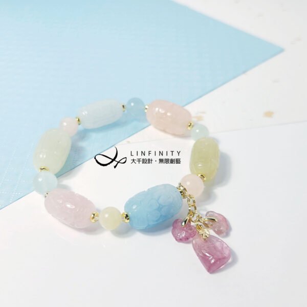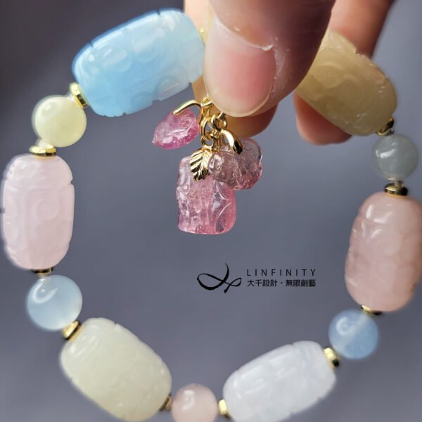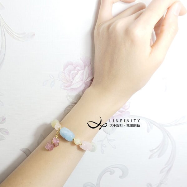 碧璽家族色彩豐富,與柔美的綠柱石搭配,寶石晶體淨透、火彩閃現,為柔粉的寶石增添些許豔麗。碧璽作為隨意扣點綴,可隨心搭配^^