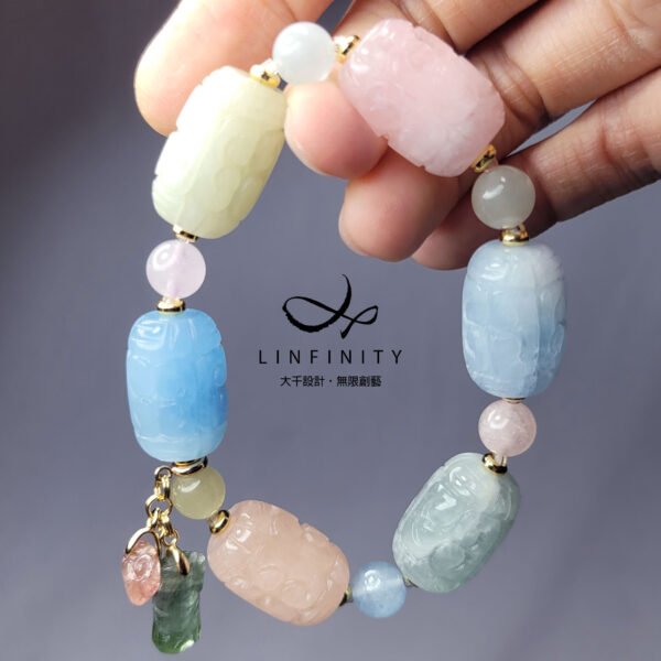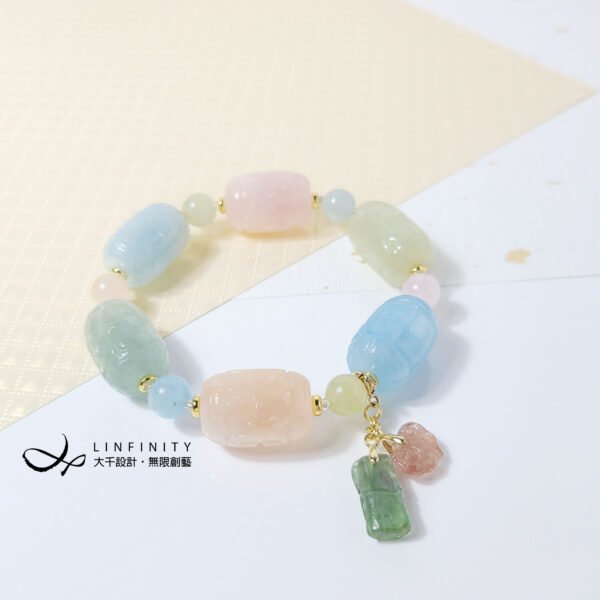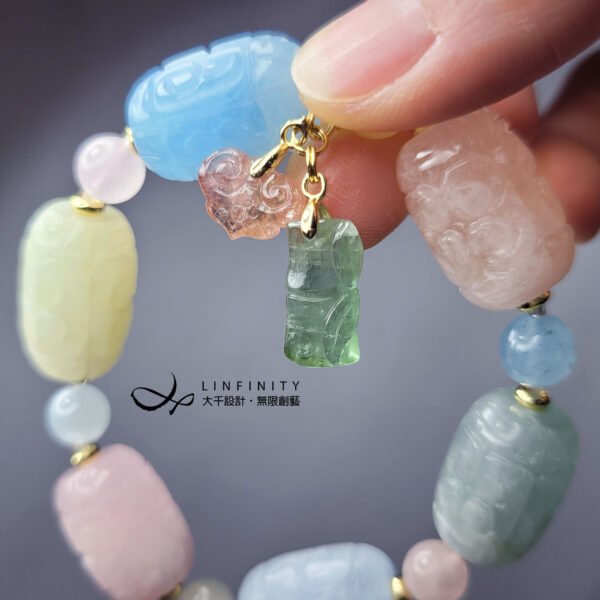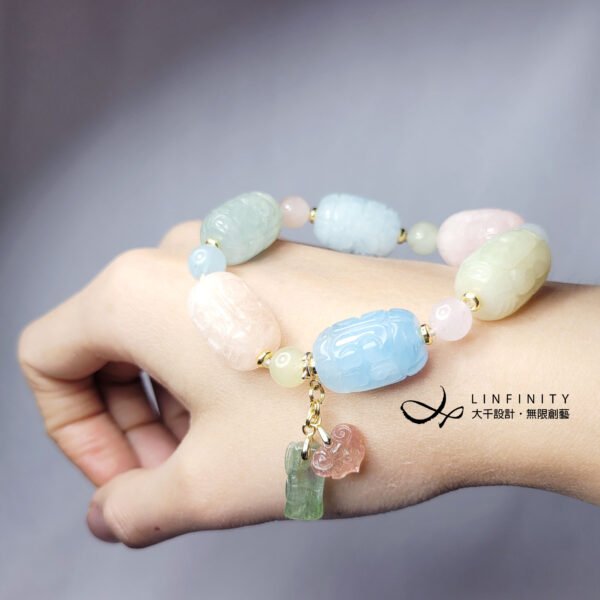 綠柱石(海藍寶、摩根石)色調浪漫柔粉、帶有透水度、閃現彩虹星光,精雕以吉祥回紋飾。