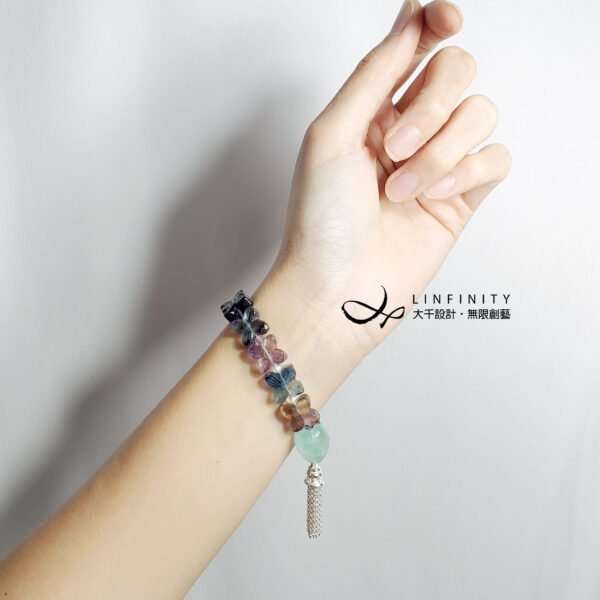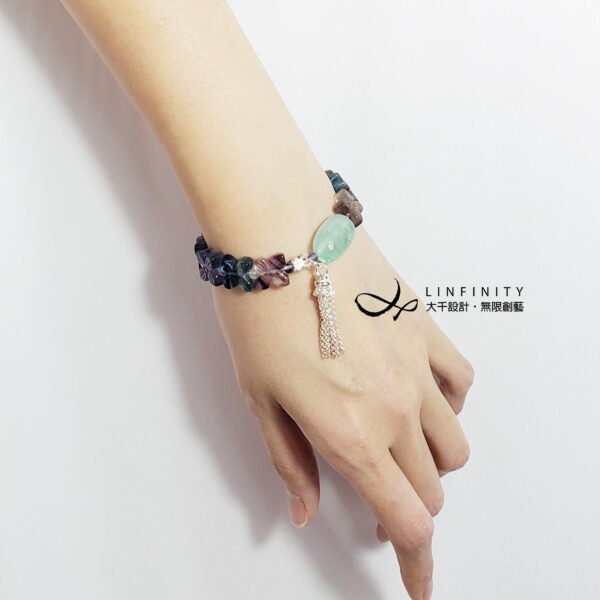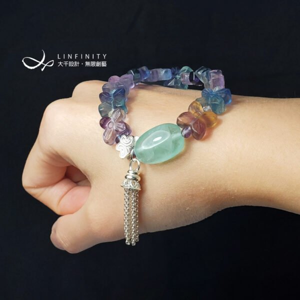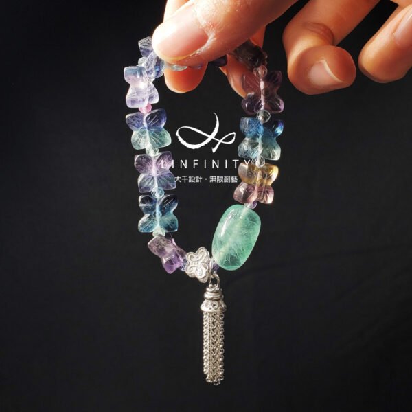 嚴選色度、透度級高之螢石,精工雕製福氣智慧永恆十字花型,寶石色彩漸層華美、水光勻淨閃耀,佐銀蝶(福氣)與流蘇飾,體現大器富貴、智慧美麗兼備的氣息。