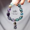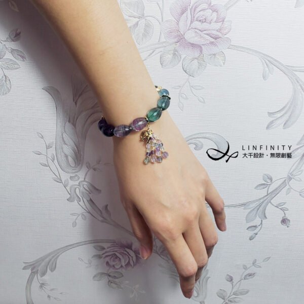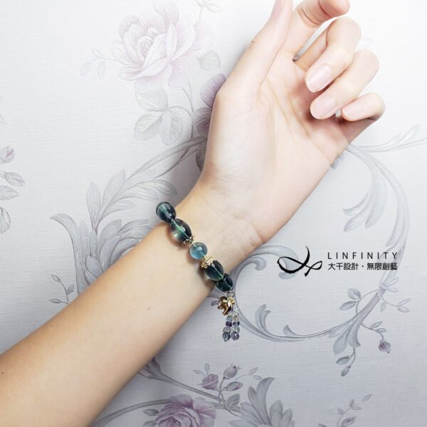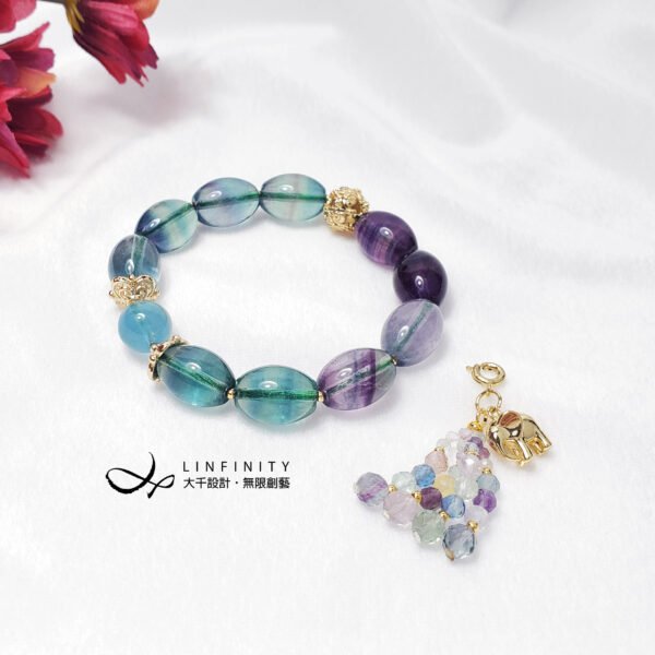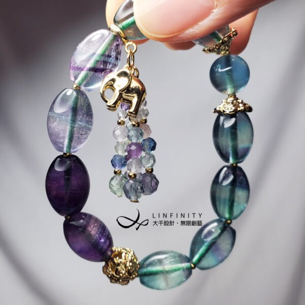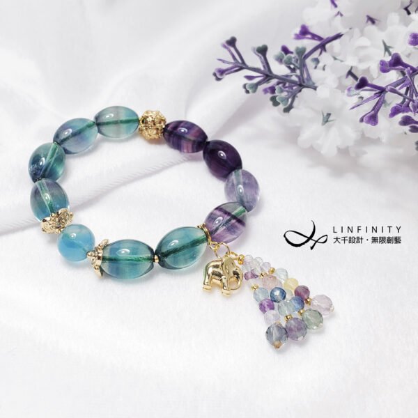 嚴選色度美、透度高之螢石,佐大象(智慧、太平有象)、鑽面螢石編流蘇隨意釦飾,寶石色彩漸層華美、水光勻淨閃耀,體現大器富貴、智慧美麗兼備的氣息。