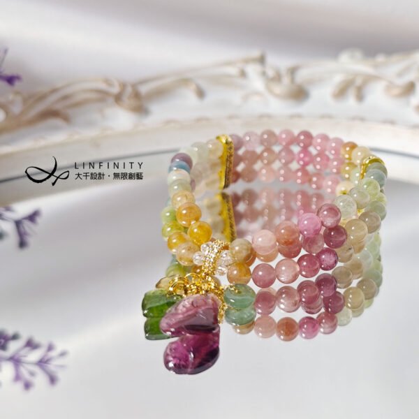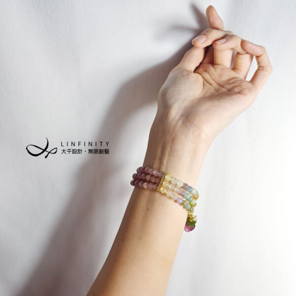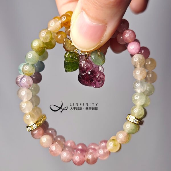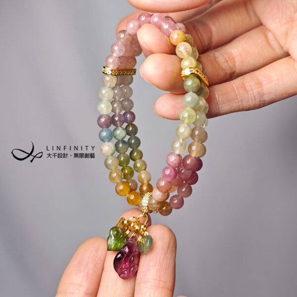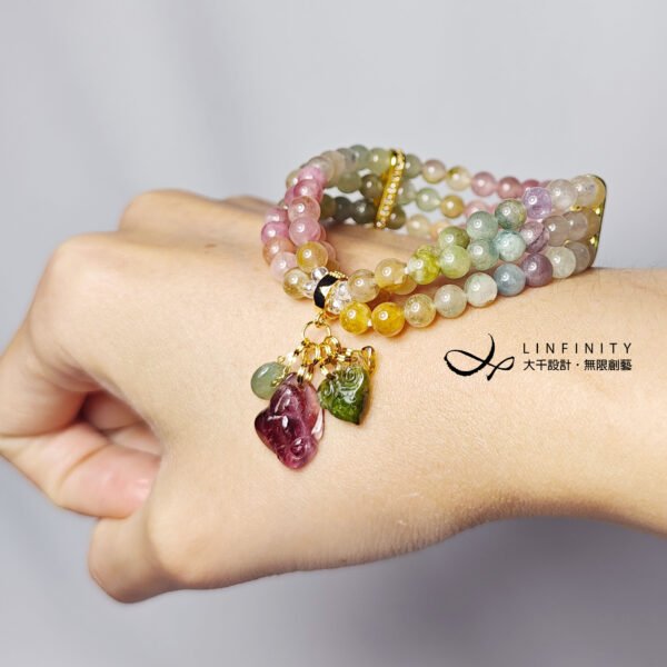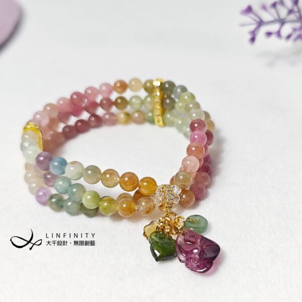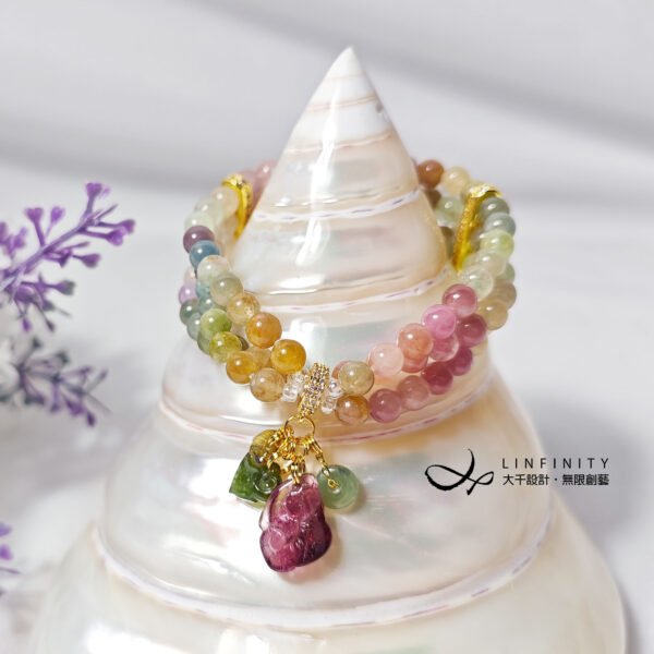 嚴選彩虹碧璽,馬卡龍(冰淇淋)色、彩虹漸層設計3排鍊身,主墜為紅、黃、綠色碧璽如意(如人所意、吉祥富貴)、藍碧璽古錢(一元復始、萬象更新)設計。