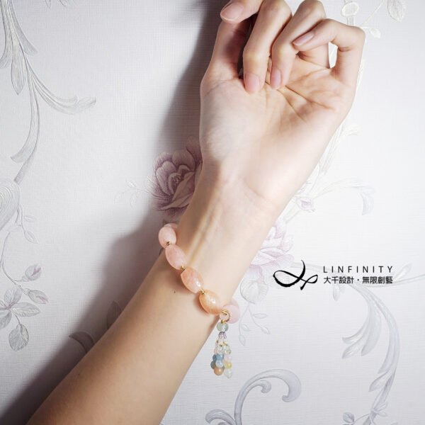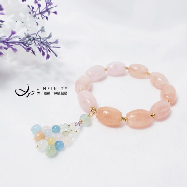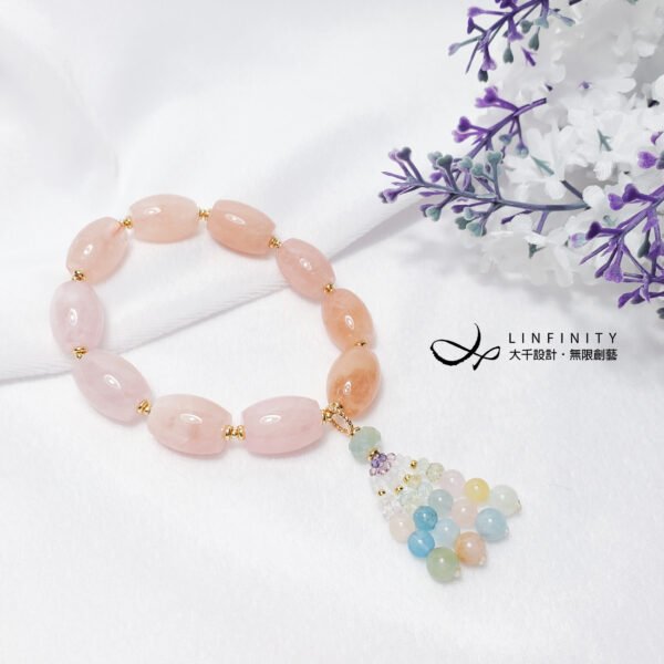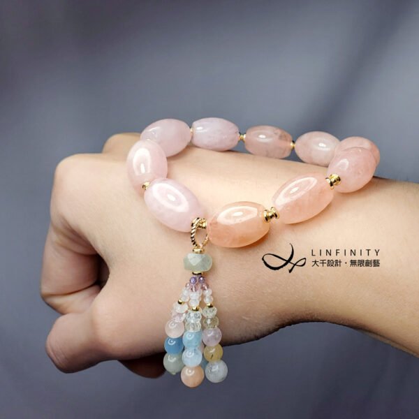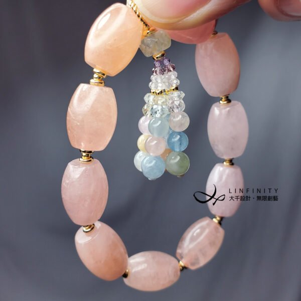 嚴選色彩勻淨、清透摩根石(粉海藍寶),寶石水光勻淨、色彩靜謐優雅、無斑、閃現星光,相佐綠柱石家族寶石精工編製流蘇,甜美可人,為招桃花、好人緣必備^^