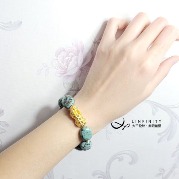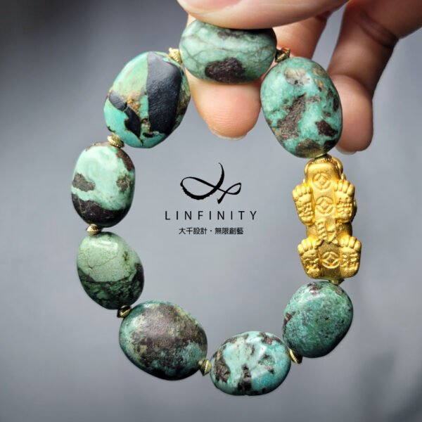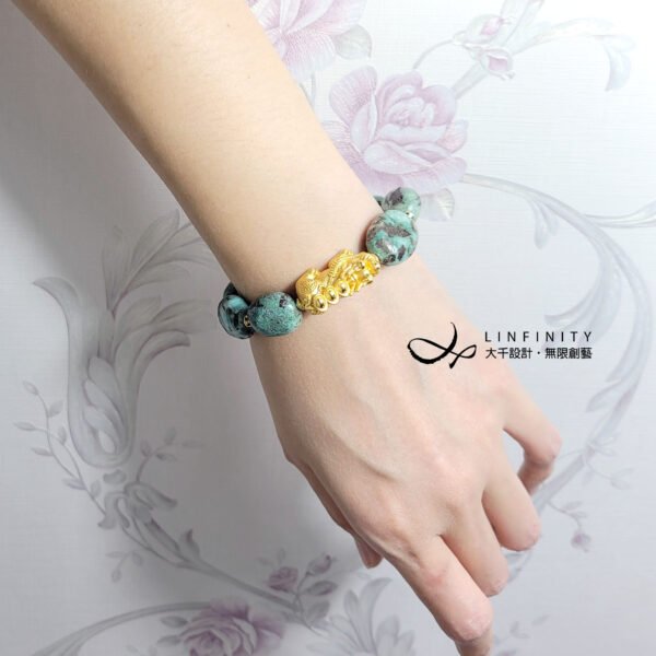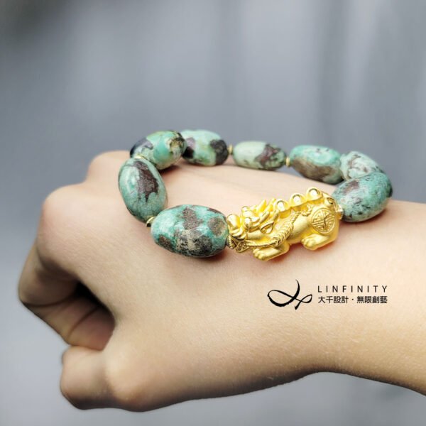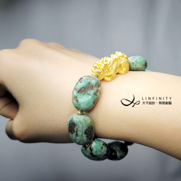 以古董寶石-松石,相佐招財神獸-貔貅,共譜強大招財能量,華麗演繹出亙久寶石的能量與美麗紋理。