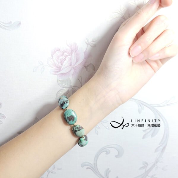 天然松石鐵線分佈寫意且優美,並能見蘋果綠、正綠、天藍等舒心藍綠色調,看似蒼松山林,也似山水墨蹟,每一顆松石宛如畫布,紀載宛若山水畫的紋理。