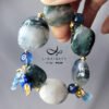 墜飾精選海藍寶多寶(蓮蓬-清淨智慧,貝-招財富貴,竹節-高風亮節)、琺瑯(船槳、一帆風順、法螺),海藍寶高透水、閃現星光、彩虹光,琺瑯藍彩正氣凜然,整體多種藍色調與水草瑪瑙相襯,富貴美麗。